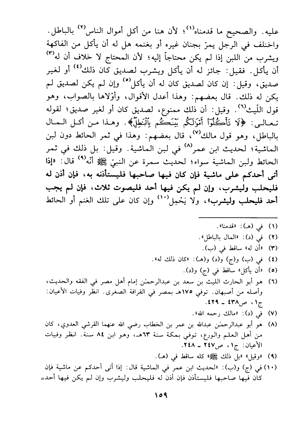 واختلف في الرجل يمر بجنان غيره أو بغنمه هل له أن يأكل من الفاكهة ويشرب من اللبن إذا لم يكن محتاجًا إليه؛ لأن المحتاج لا خلاف أن له أن يأكل. فقيل: جائز له أن يأكل ويشرب لصديق كان ذلك أو لغير صديق، وقيل: أن كان لصديق كان له أن يأكل وإن لم يكن لصديق لم يكن له ذلك. قال بعضهم: وهذا أعدل الأقوال، وأولاها بالصواب، وهو قول الليث. وقيل: أن ذلك ممنوع، لصديق كان أو لغير صديق؛ لقوله تعالى: {لا تأكلوا أموالكم بينكم بالباطل}. وهذا من أكل المال بالباطل، وهو قول مالك، وقال بعضهم: وهذا في ثمر الحائط دون لبن الماشية؛ لحديث ابن عمر في لبن الماشية. وقيل: بل ذلك في ثمر الحائط ولبن الماشية سواء؛ لحديث سمرة عن النبي صلى الله عليه وسلم أنه قال: ((إذا أتى أحدكم على ماشية فإن كان فيها صاحبها فليستأذنه به، فإن أذن له فليحلب وليشرب، وإن لم يكن فيها أحد فليصوت ثلاث، فإن لم يجب أحد فليحلب وليشرب))، ولا يحتمل وإن كان على تلك الغنم أو الحائط