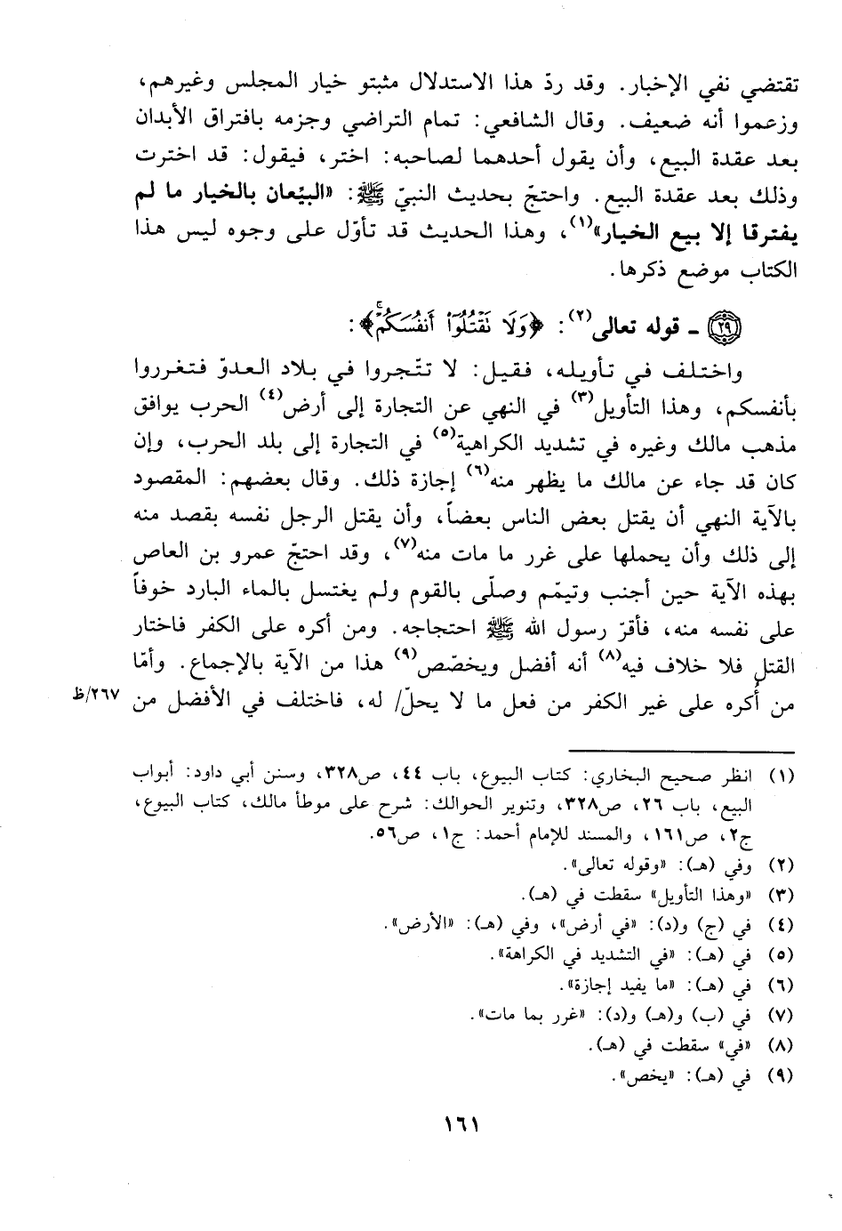 تقتضي نفي الأخبار. وقد رد هذا الاستدلال مثبتو خيار المجلس وغيرهم، وزعموا أنه ضعيف. وقال الشافعي: تمام التراضي وجزمه بافتراق الأبدان بعد عقدة البيع، وأن يقول أحدهما لصاحبه: اختر، فيقول: قد اخترت وذلك بعد عقدة البيع. واحتج بحديث النبي صلى الله عليه وسلم: ((البيعان بالخيار ما لم يفترقا إلا بيع الخيار))، وهذا بحديث قد تأول على وجوه ليس هذا الكتاب موضع ذكرها.