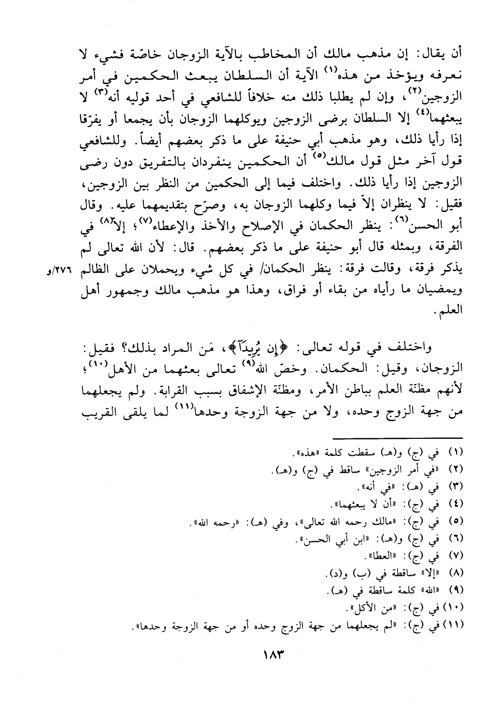 أن يقال: إن مذهب مالك أن المخاطب بالآية الزوجان خاصة فشيء لا تعرفه ويؤخذ من هذه الآية أن السلطان يبعث الحكمين في أمر الزوجين، وإن لم يطلبا ذلك منه خلافًا للشافعي في أحد قوليه أنه لا يبعثهما إلا السلطان برضى الزوجين ويوكلهما الزوجان بأن يجمعا أو يفرقا إذا رأيا ذلك، وهو مذهب أبي حنيفة على ما ذكر بعضم أيضًا. وللشافعي قول آخر مثل قول مالك أن الحكمين ينفردان بالتفريق دون رضة الزوجين إذا رأيا ذلك. واختلف فيما إلى الحكمين من النظر بين الزوجين، فقيل: لا ينظران إلا فيما وكلهما الزوجان به، وصرح بتقديمهما عليه. وقال أبو الحسن: ينظر الحكمان في الإصلاح والأخذ والإعطاء؛ إلا في الفرقة، وبمثله قال أبو حنيفة على ما ذكر بعضهم. قال: لأن الله تعالى يذكر فرقة، وقالت فرقة: ينظر الحكمان في كل شيء ويحملان على الظالم ويمضيان ما رأياه من بقاء أو فراق، وهذا هو مذهب مالك وجمهور أهل العلم.
