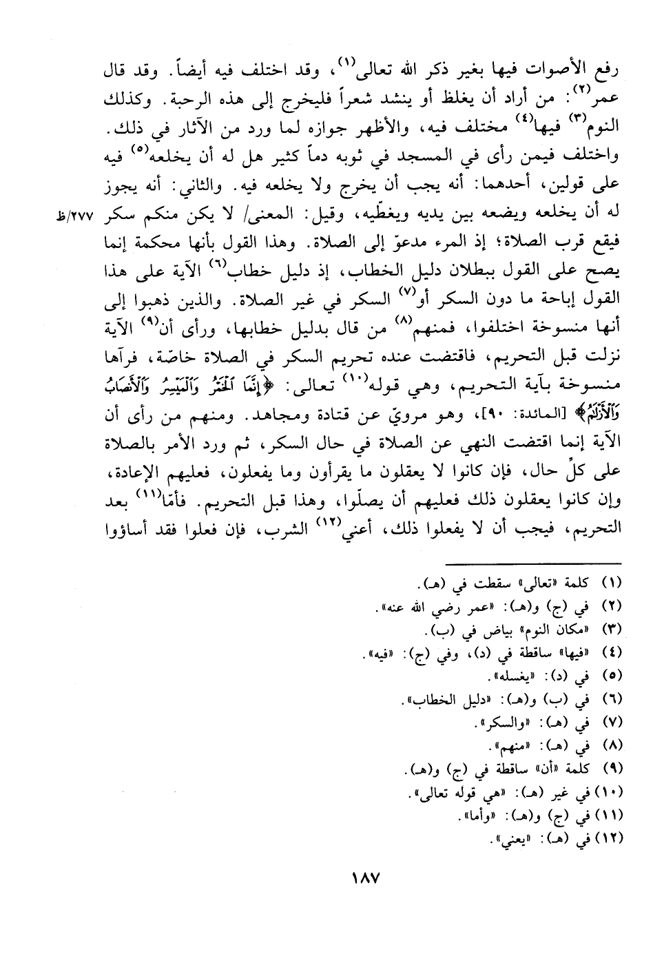 واختلف فيمن رأى في المسجد في ثوبه دمًا كثير هل له أن يخلعه فيه على قولين، أحدهما: أنه يجب أن يخرج ولا يخلعه فيه. والثاني: أنه يجوز له أن يخلعه ويضعه بين يديه ويغطيه، وقيل: المعنى لا يكن منكم سكر فيقع قرب الصلاة؛ إذ المرء مدعو إلى الصلاة. وهذا القول بأنها محكمة إنما يصح على القول ببطلان دليل الخطاب، إذ دليل خطاب الآية على هذا القول إباحة ما دون السكر أو السكر في غير الصلاة. والذين ذهبوا إلى أنها منسوخة اختلفوا، فمنهم من قال بدليل خطابها، ورأى أن الآية نزلت قبل التحريم، فاقتضت عنده تحريم السكر في الصلاة خاصة، فرآها منسوخة بآية التحريم، وهي قوله تعالى: {إنما الخمر والميسر والأنصاب والأزلام} [المائدة: 90]، وهو مروي عن قتادة ومجاهد. ومنهم من رأى أن الآية إنما اقتضت النهي عن الصلاة في حال السكر، ثم ورد الأمر بالصلاة على كل حال، فإن كانوا لا يعقلون ما يقرأون وما يفعلون، فعليهم الإعادة، وإن كانوا يعقلون ذلك فعليهم أن يصلوا، وهذا قبل التحريم. فأم بعد التحريم، فيجب أن لا يفعلوا ذلك، أعني الشرب، فإن فعلوا فقد أساؤوا