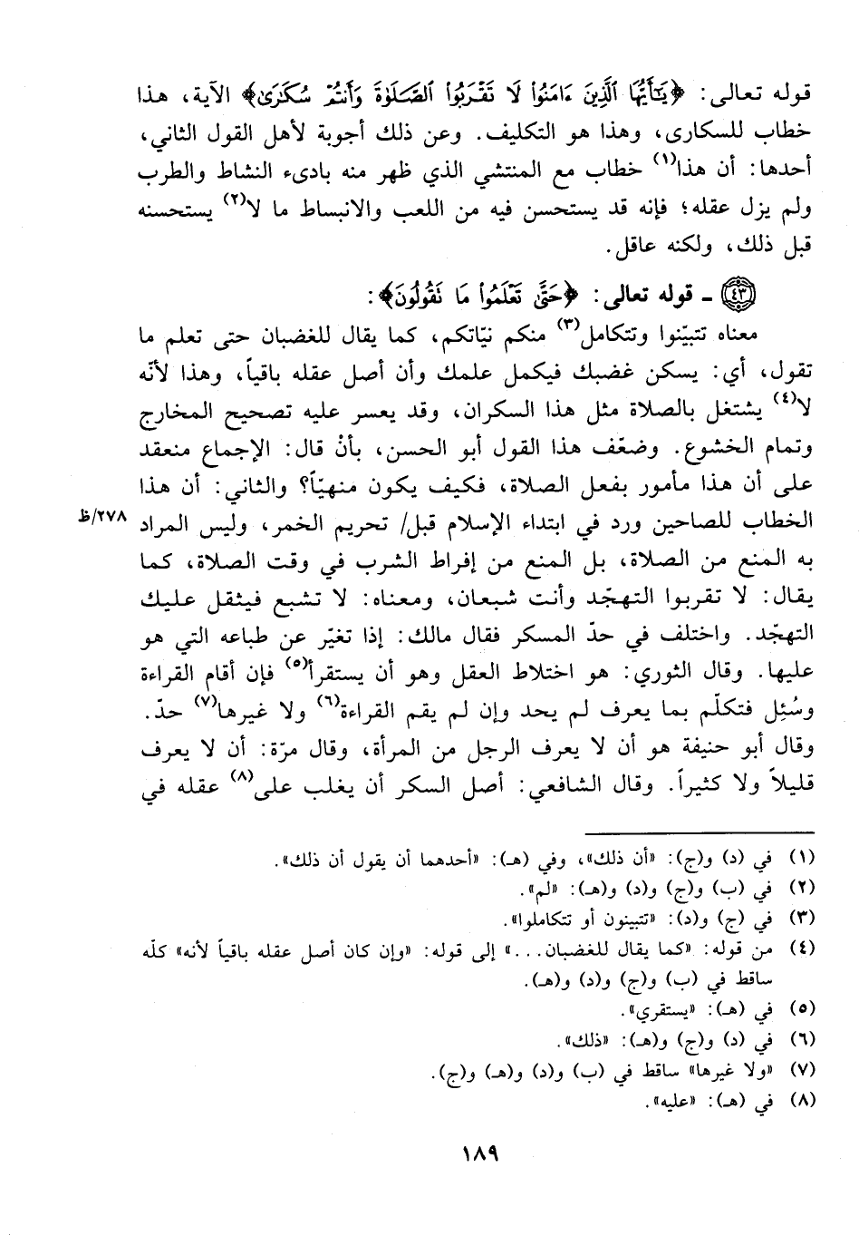 معناه تتبينوا وتتكامل منكم نياتكم، كم يقال للغضبان حتى تعلم ما تقول، أي: يسكن غضبك فيكمل علمك وأن أصل عقله باقيًا، وهذا لأنه لا يستغل بالصلاة مثل السكران، وقد يعسر عليه تصحيح المخارج وتمام الخشوع. وضعف هذا القول أبو الحسن، بأن قال: الإجماع منعقد على أن هذا مأمور بفعل الصلاة، فكيف يكون منهيًا؟ والثاني: أن هذا الخطاب للصاحين ورد في ابتداء الإسلام قبل تحريم الخمر، وليس المراد به المنع ن الصلاة، بل المنع من إفراط الشرب في وقت الصلاة، كما يقال: لا تقرب التهجد وأنت شبعان، ومعناه: لا تشبع فيثقل عليك التهجد. واختلف في حد المسكر فقال مالك: إذا تغير عن طباعه التي هو عليها. وقال الثوري: هو اختلاط العقل وهو أن يستقرأ فإن أقام القراءة وسئل فتكلم بما يعرف لم يحد وإن لم يقم القراءة ولا غيرها حد.