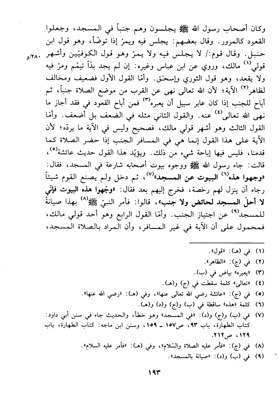 وكان أصحاب رسول الله صلى الله عليه وسلم يجلسون وهو جنبًا في المسجد، وجعلوا القعود كالمرور. وقال بعضهم: يجلس فيه ويمر إذا توضأ، وهو قول ابن حنبل. وقال قوم: لا يجلس فيه ولا يمر وهو قول الكوفيين وأشهر قولي مالك، وروي عن ابن عباس وغيره: إن لم يجد بدًا تيمم ومر فيه ولا يقعد، وهو قول الثوري وإسحاق. وأما القول الأول فضعيف ومخالف لظاهر الآية؛ لأن الله تعالى نهى عن القرب من موضع الصلاة جنبًا، ثم أباح للجنب إذا كان عابر سبيل أن يعبره فمن أباح القعود فيه فقد أجاز ما نهى الله تعالى عنه. والقول الثاني مثله في الضعف بل أضعف. وأما القول الثالث وهو أشهر قولي مالك، فصحيح وليس في الآية ما يرده؛ لأن الآية على هذا القول إنما هي في المسافر الجنب إذا حضر الصلاة كما قدمنا، فليس فيها إباحة شيء من ذلك. ويؤيد هذا القول حديث عائشة، قالت: جاء رسول الله صلى الله عليه وسلم ووجوه بيوت أصحابه شارعة في المسجد، فقال: ((وجهوا هذه البيوت عن المسجد))، ثم دخل ولم يصنع القوم شيئًا رجاء أن ينزل لهم رخصة، فخرج إليهم بعد فقال: ((وجهوا هذه البيوت فإني لا أحل المسجد لحائض ولا جنب))، قالوا: فأمر النبي صلى الله عليه وسلم بهذا صيانة للمسجد عن اجتياز الجنب. وأما القول الرابع وهو أحد قولي مالك، فمحمول على أن الآية في غير المسافر، وأن المراد بالصلاة المسجد،