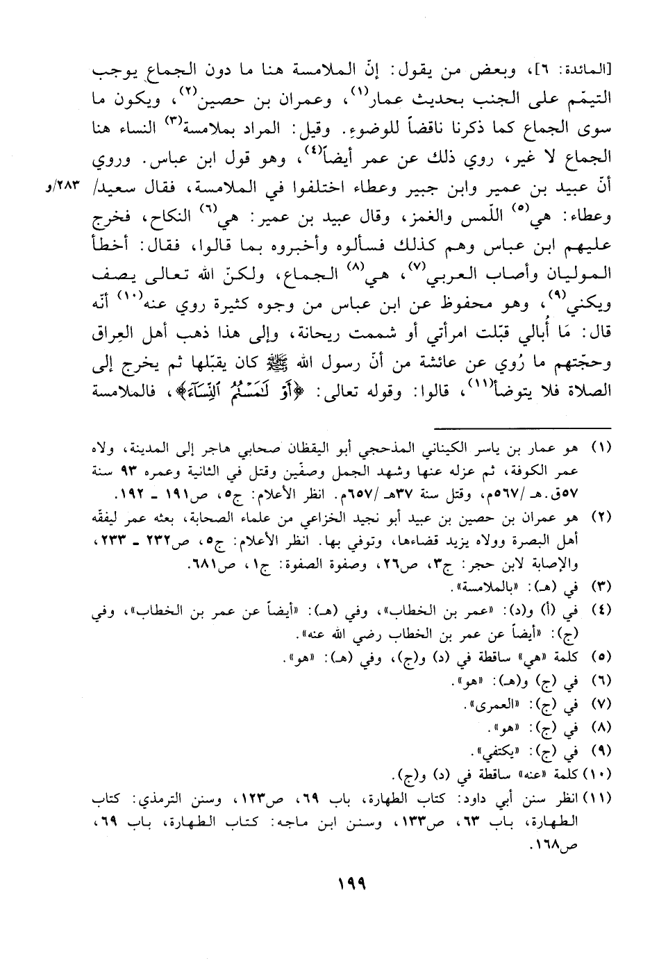 [المائدة: 6]، وبعض من يقول: إن الملامسة هنا ما دون الجماع يوجب التيمم على الجنب بحديث عمار، وعمران بن حصين، ويكون ما سوى الجماع كما ذكرنا ناقضًا للوضوء. وقيل: المراد بملامسة النساء هنا الجماع لا غير، روي ذلك عن عمر أيضًا، وهو قول ابن عباس. وروي أن عبيد بن عمير وابن جبير وعطاء اختلفوا في الملامسة، فقال سعيد وعطاء: هي اللمس والغمز، وقال عبيد بن عمير: هي النكاح، فخرج عليهم ابن عباس وهم كذلك فسألوه وأخبروه بما قالوا، فقال: أخطأ الموليان وأصاب العربي، هي الجماع، ولكن الله تعالى يصف ويكني، وهو محفوظ عن ابن عباس من وجوه كثيرة روي عنه أنه قال: ما أبالي قبلت امرأتي أو شممت ريحانة، وإلى هذا ذهب أهل العراق وحجتهم ما وري عن عائشة من أن رسول الله صلى الله عليه وسلم كان يقبلها ثم يخرج إلى الصلاة فلا يتوضأ، قالوا: وقوله تعالى: {أو لامستم النساء}، فالملامسة