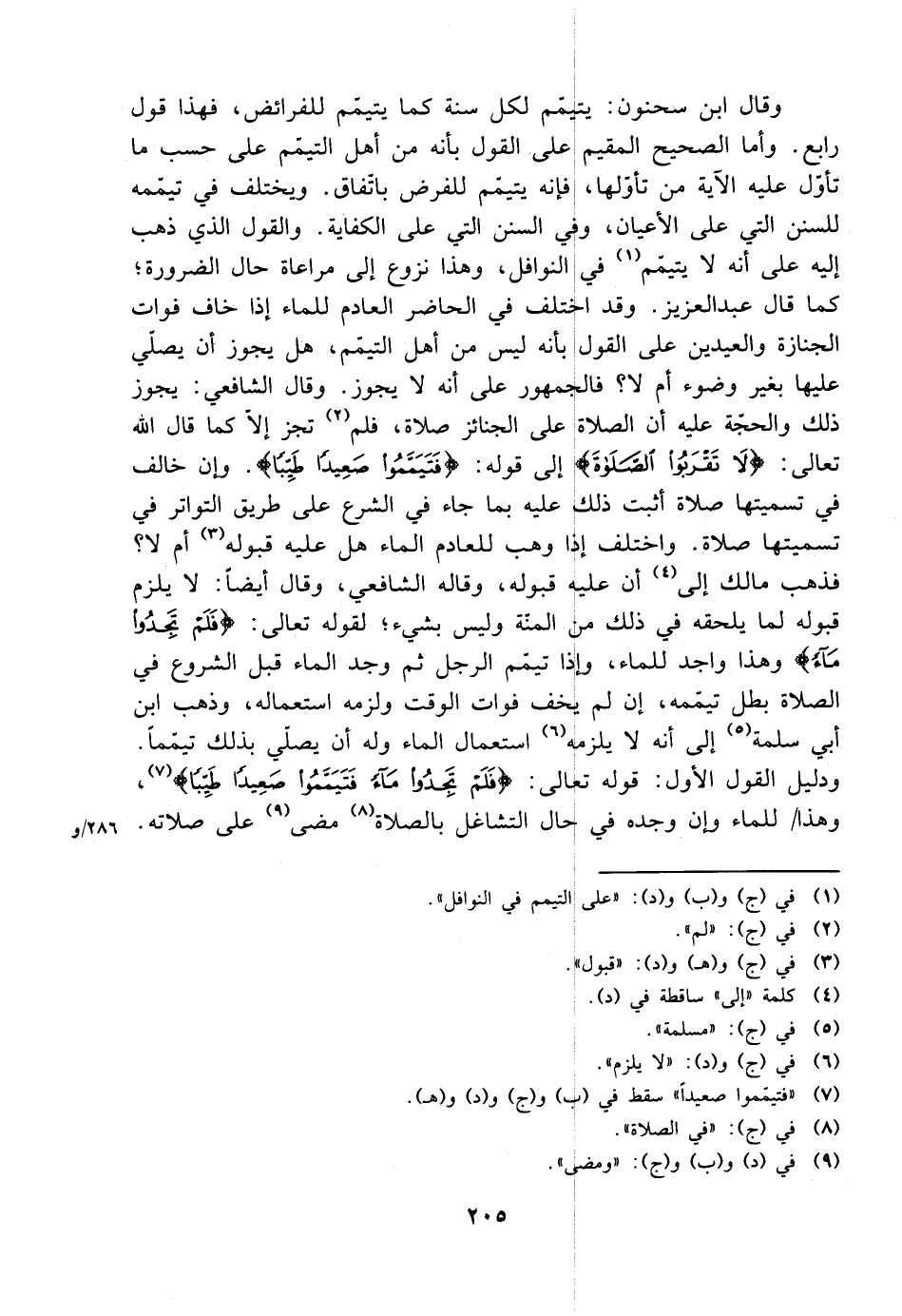وقال ابن سحنون: يتيمم لكل سنة كما يتيمم للفرائض، فهذا قول رابع. وأما الصحيح المقيم على القول بأنه من أهل التيمم على حسب ما تأول عليه الآية من تأولها، فإنه يتيمم للفرض باتفاق. ويختلف في تيممه للسنن التي على الأعيان، وفي السنن التي على الكفاية. والقول الذي ذهب إليه على أنه لا يتيمم في النوافل، وهذا نزوع إلى مراعاة حال الضرورة؛ كما قال عبد العزيز. وقد اختلف في الحاضر العادم للماء إذا خاف فوات الجنازة والعيدين على القول بأنه ليس من أهل التيمم، هل يجوز أن يصلي عليها بغير وضوء أم لا؟ فالجمهور على أنه لا يجوز. وقال الشافعي: يجوز ذلك والحجة عليه أن الصلاة على الجنائز صلاة/ فلم تجز إلا كما قال الله تعالى: {لا تقربوا الصلاة} إلى قوله: {فتيمموا صعيدًا طيبًا}. وإن خالف في تسميتها صلاة أثبت ذلك عليه بما جاء في الشرع على طريق التواتر في تسميتها صلاة. واختلف إذا وهب للعادم الماء هل عليه قبوله أم لا؟ فذهب مالك إلى أن عليه قبوله، وقاله الشافعي، وقال أيضًا: لا يلزم قبوله لما يلحقه في ذلك من المنة وليس بشيء؛ لقوله تعالى: {فلم تجدوا ماء} وهذا واجد للماء، وإذا تيمم الرجل ثم وجد الماء قبل الشروع في الصلاة بطل تيممه، إن لم يخف فوات الوقت ولزمه استعماله، وهذب ابن أبي سلمة إلى أنه ل يلزمه استعمال الماء وله أن يصلي بذلك تيممًا.