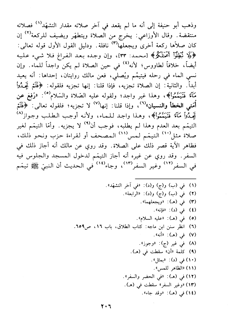 وذهب أبو حنيفة إلى أنه ما لم يقعد في آخر صلاته مقدار التشهد فصلته منتقضة. وقال الأوزاعي: يخرج من الصلاة ويتطهر ويضيف للركعة إن كان صلاها ركعة أخرى ويجعلها نافلة. ودليل القول الأول قوله تعالى: {ولا تبطلوا أعمالكم} [محمد: 33]، وإن وجده بعد الفراغ فلا شيء عليه أيضًا، خلافًا لطاووس؛ لأنه في حين الصلاة لم يكن واجدًا للماء. وإن نسي الماء في رحلة فيتيمم ويصلي، فعن مالك روايتان، أحداهما: أنه يعيد أبدًا. والثانية: إن الصلاة تجزيه، فإن قلنا: إنها تجزيه فلقوله: {فلم تجدوا ماء فتيمموا}، وهذا غير واجد؛ ولقوله عليه الصلاة والسلام: ((رفع عن أمتي الخطأ والنسيان))، وإذا قلنا: إنها لا تجزيه؛ فلقوله تعالى: {فلم تجدوا ماء فتيمموا}، وهذا واجد للماء، ولأنه أوجب الطلب وجواز التيمم بعد العدم وهذا لم يطلبه، فوجب أن لا يجزيه. وأما التيمم لغير صلاة مثل التيمم لمس المصحف أو لقراءة حزب ونحو ذلك، فظاهر الآية قصر ذلك على الصلاة. وذد روي عن مالك أنه أجاز ذلك في السفر. وقد روي عن غيره أنه أجاز التيمم لدخول المسجد والجلوس فيه في السفر وغير السفر، وجاء في الحديث أن النبي صلى الله عليه وسلم تيمم