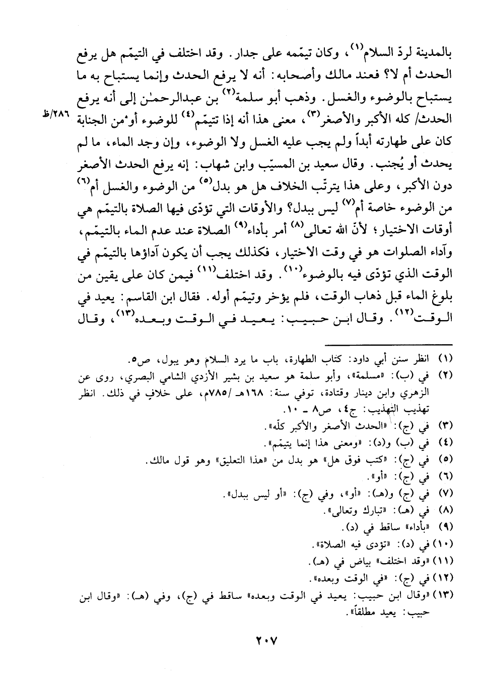 بالمدينة لرد السلام، كان تيممه على جدار. وقد اختلف في التيمم هل يرفع الحدث أم لا؟ فعند مالك وأصحابه: أنه لا يرفع الحدث وإنما يستباح به ما يستباح بالوضوء والغسل. وذهب أبو سلمة بن عبد الرحمن إلى أنه يرفع الحدث كله الأكبر والأصغر، معنى هذا أنه إذا تيمم للوضوء أم من الجنابة كان على طهارته أبدًا ولم يجب عليه الغسل ولا الوضوء، وإن وجد الماء، ما لم يحدث أو يجنب. وقال سعيد بن المسيب وبن شهاب: إنه يرفع الحدث الأصغر دون الأكبر، وعلى هذا يترتب الخلاف هل هو بدل من الوضوء والغسل أم من الوضوء خاصة أم ليس ببدل؟ والأوقات التي تؤدى فيها الصلاة بالتيمم هي أوقات الاختيار؛ لأن الله تعالى أمر بأداء الصلاة عند عدم الماء بالتيمم، وأداء الصلوات هو في وقت الاختيار، فكذلك يجب أن يكون أداؤها بالتيمم في الوقت الذي تؤدى فيه بالوضوء. وقد اختلف فيمن كان على يقين من بلوغ الماء قبل ذهاب الوقت، فلم يؤخر وتيمم أوله. فقال ابن القاسم: يعيد في الوقت. وقال ابن حبيب: يعيد في الوقت وبعده، وقال