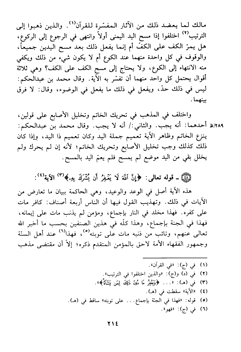 مالك لما يعضد ذلك من الآثار المفسرة للقرآن. والذين ذهبوا إلى الترتيب اختلفوا إذا مسح اليد اليمنى أولًا وانتهى في الرجوع إلى الكوع، هل يمر الكف على الكف أم إنما يفعل ذلك بعد مسح اليدين جميعًا، والوقوف في كل واحدة منهما عند الكوع أم لا يكون شيء من ذلك ويكفي منه الانتهاء إلى الكوع، ولا يحتاج إلى مسح الكف على الكف؟ وهي ثلاثة أقوال يحتمل كل واحد منهما أن تفسر به الآية. وقال محمد بن عبد الحكم: ليس في ذلك حد، ويفعل في ذلك ما يفعل في الوضوء، وقال: لا فرق بينهما.