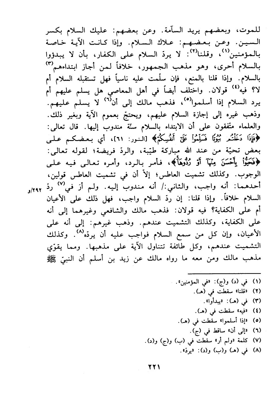 والعلماء متفقون على أن الابتداء بالسلام سنة مندوب إليها. قال تعالى: {فإذا دخلتم بيوتًا فسلموا على أنفسكم} [النور: 61]، أي بعضكم على بعض تحية من عند الله مباركة طبية، والرد فريضة؛ لقوله تعالى: {فحيوا بأحسن منها أو ردوها}، فأمر بالرد، وأمرع تعالى فيه على الوجوب. وكذلك تشميت العاطس؛ إلا أن في تشميت العاطس قولين، أحدهما: أنه واجب، والثاني: أنه مندوب إليه. ولم أر في رد السلام خلافًا. وإذا قلنا: إن رد السلام واجب، فهل ذلك على الأعيان أم على الكفاية؟ فيه قولان: فذهب مالك والشافعي وغيرهما إلى أنه على الكفاية، وكذلك التشميت عندهم. وذهب غيرهم إلى أنه على الأعيان، وإن كل من سمع السلام فواجب عليه أن يرده. وكذلك التشميت عندهم، وكل طائفة تتناول الآية على مذهبها. ومما يقوي مذهب مالك ومن معه ما وراه مالك عن زيد بن أسلم أن النبي صلى الله عليه وسلم