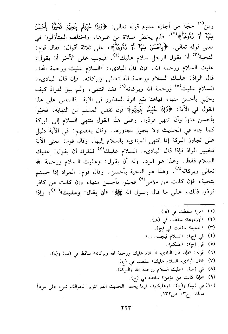 ومن حجة من أجازه عموم قوله تعال: {وإذا حييتم بتحية فحيوا بأحسن منها أو ردوها}: فلم يخص صلاة من غيرها. واختلف المتأولون في معنى قوله تعالى: {بأحسن منها أو ردوها}، على ثلاثة أقوال: فقال قوم: التحية أن يقول الرجل سلام عليك. فيجب على الآخر أن يقول: عليك السلام ورحمة الله. فإن قال البادئ: ((السلام عليك ورحمة الله)). قال الراد: عليك السلام ورحمة الله تعالى وبركاته. فإذا قال البادئ: السلام عليك ورحمة الله وبركاته فقد انتهى، ولم يبق للراد كيف يحيي بأحسن منها، فها هنا يقع الرد المذكور في الآية. فالمعنى على هذا القول في الآية: {وإذا حييتم بتحية} فإن نقص المسلم من النهاية، فحيوا بأحسن منها وأن انتهى فردوا. وعلى هذا القول ينتهي السلام إلى البركة كما جاء في الحديث ولا يجوز تجاوزها. وقال بعضهم: في الآية دليل على تجاوز البركة إذا انتهى المبتدئ بالسلام إليها. وقال قوم: معنى الآية تخيير الراد فإذا قال البادئ: السلام عليك فللراد أن يقول: عليك السلام فقط. وهذا هو الرد. وله أن يقول: وعليك السلام ورحمة الله تعالى وبركاته. وهذا هو التحية بأحسن. وقال قوم: المراد إذا حيتتم بتحية، فإن كانت من مؤمن فحيوا بأحسن منها، وإن كانت من كافر فردوا ذلك، على ما قال رسول الله صلى الله عليه وسلم: ((أن يقال: وعليك))، وإذا
