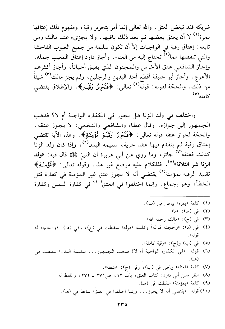وأجاز الشافعي عتق الأخرس والمجنون الذي يفيق أحيانًا، وأجاز أكثرهم الأعرج. وأجاز أبو حنيفة أقط أحد اليدين والرجلين، ولم يجز مالك شيئًا من ذلك. والحجة لقوله: قوله تعالى: {فتحرير رقبة}، والإطلاق يقتضي كامله.