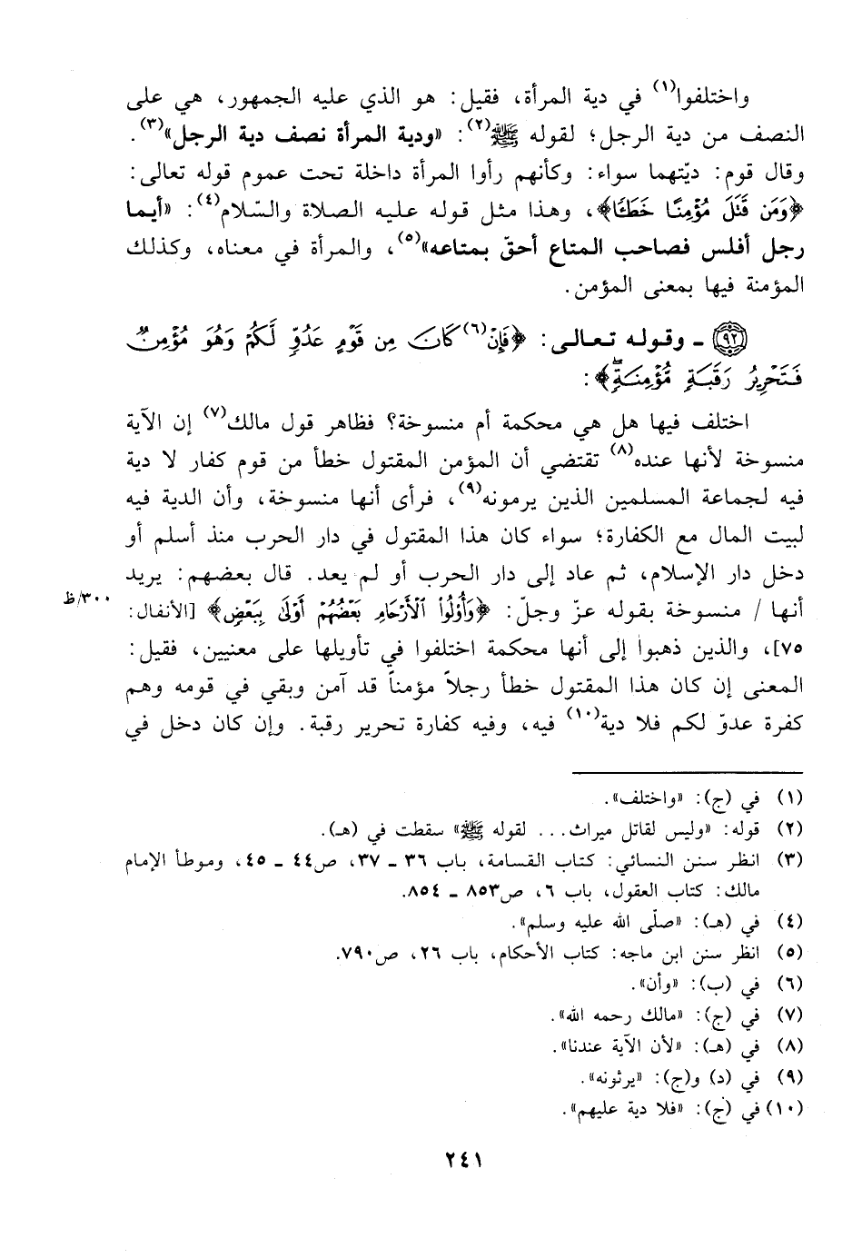 واختلفوا في دية المرأة، فقيل: هو الذي عليه الجمهور، هي على النصف من دية الرجل؛ لقوله صلى الله عليه وسلم: ((ودية المرأة على نصف من دية الرجل)). وقال قوم: ديتها سواء: وكأنهم رأوا المرأة داخلة تحت عموم قوله تعالى: {ومن قتل مؤمنًا خطئًا}، وهذا مثل قوله عليه الصلاة والسلام: ((أيما رجل أفلس فصاحب المتاع أحق بمتاعه))، والمرأة في معناه، وكذلك المؤمنة فيها بمعنى المؤمن.