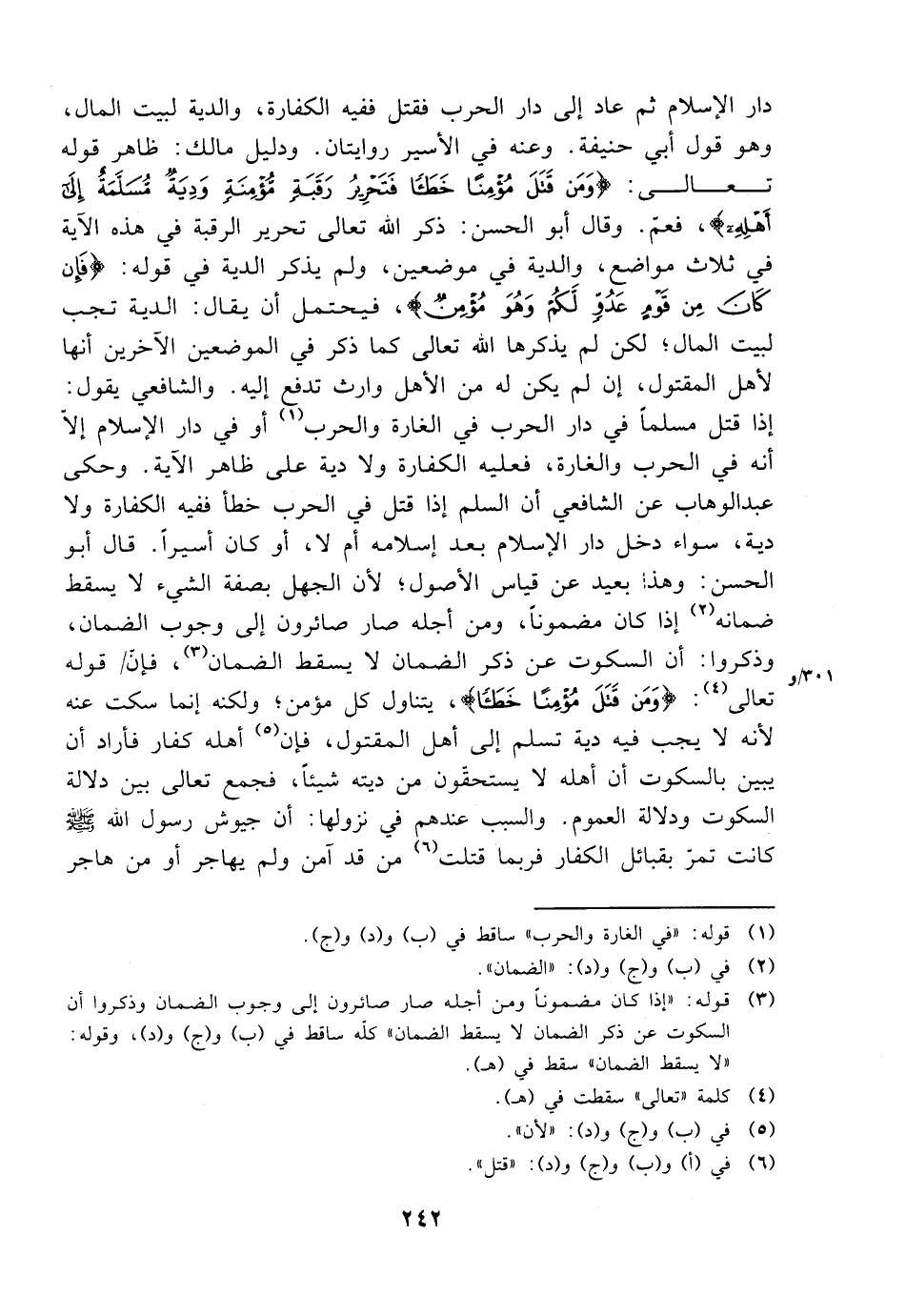 دار الإسلام ثم عاد إلى دار الحرب فقتل ففيه الكفارة، والدية لبيت المال، وهو قول أبي حنيفة. وعنه في الأسير روايتان. ودليل مالك: ظاهر قوله تعالى: {ومن قتل مؤمنًا خطئًا فتحرير رقبة مؤمنة ودية مسلمة إلى أهله}، فعم. وقال أبو الحسن: ذكر الله تعالى تحرير الرقبة في هذه الآية في ثلاث مواضع، والدية في موضعين، ولم يذكر الدية في قوله: {فإن كان من قوم عدو لكم وهو مؤمن}، فيحتمل أن يقال: الدية تجب لبيت المال؛ لكن لم يذكرها الله تعالى كما ذكر في الموضعين الآخرين أنها لأهل المقتول، إن لم يكن له من الأهل وارث تدفع إليه. والشافعي يقول: إذا قتل مسلمًا في دار الحرب في الغارة والحرب أو في دار الإسلام إلا أنه في الحرب والغارة، فعليه الكفارة ولا دية على ظاهر الآية. وحكى عبد الوهاب عن الشافعي أن السلم إذا قتل في الحرب خطأ ففيه الكفارة ولا دية، سواء دخل دار الإسلام بعد إسلامه أم لا، أو كان أسيرًا. وقال أبو الحسن: وهذا بعيد عن قياس الأصول؛ لأن الجهل بصفة الشيء لا يسقط ضمانه إذا كان مضمونًا، ومن أجله صار صائرون إلى وجوب الضمان، وذكروا أن السكوت عن ذكر الضمان لا يسقط الضمان، فإن قوله تعالى: {ومن قتل مؤمنًا خطئًا}، يتناول كل مؤمن؛ ولكنه إنما سكت عنه لأنه لا يجب فيه دية تسلم إلى أهل المقتول، فإن أهله كفار فأراد أن يبين بالسكوت ودلالة العموم. والسبب عندهم في نزولها أن جيوش رسول الله صلى الله عليه وسلم كانت تمر بقبائل الكفار فربما قتلت من قد آمن ولم يهاجر أو من هاجر
