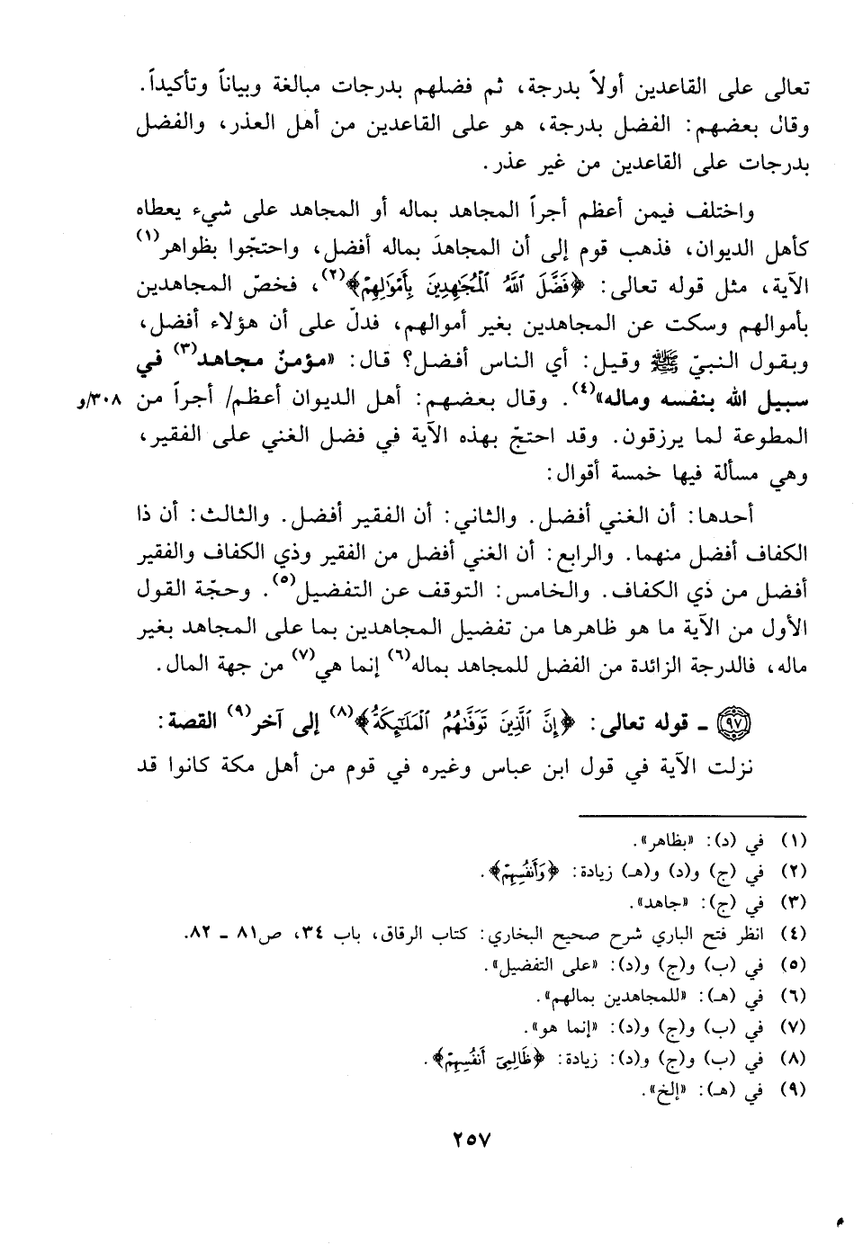 أحدها: أن الغني أفضل. والثاني: أن الفقير أفضل. والثالث: أن ذا الكفاف أفضل منهما. والرابع: أن الغني أفضل من الفقير وذي الكفاف والفقير أفضل من ذي الكفاف. والخامس: التوقف عن التفضيل. وحجة القول الأول من الآية ما هو ظاهرها من تفضيل المجاهدين بما على المجاهد بغير ماله، فالدرجة الزائدة من الفضل للمجاهد بماله إنما هي من جهة المال.