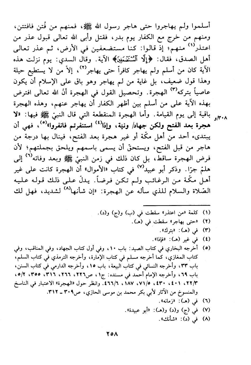 أسلموا ولم يهاجروا حتى هاجر رسول الله صلى الله عليه وسلم، فمنهم من فتن فافتتن، ومنهم من خرج مع الكفار يوم بدر، فقتل وأبى الله تعالى قبول عذر من اعتذر منهم؛ إذ قالوا: كنا مستضعفين في الأرض، ثم عذر تعالى أهل الصدق، فقال: {إلا المستضعفين} الآية. وقال السدي: يوم نزلت هذه الآية كان من أسلم ولم يهاجر كافرًا حتى يهاجر، إلا من لا يستطيع حيلة وهذا قول ضعيف، بل غاية من لم يهاجر وهو باق على الإسلام أن يكون عاصيه بتركه الهجرة. وتحصيل القول في الهجرة أن الله تعالى افترض بهذه الآية على من أسلم بين أظهر الكفار أن يهاجر عنهم، وهذه الهجرة باقية إلى يوم القيامة. وأما الهجرة المنقطعة التي قال النبي صلى الله عليه وسلم فيها: ((لا هجرة بعد الفتح ولكن جهاد ونية، وإذا استنفرتم فانفروا))، فهي أن يبتدئ أحد من أهل مكة أو غير هجرة بعد الفتح، فينال بها درجة من هاجر من قبل الفتح، ويستحق أن يسمى باسمهم ويلحق بجملتهم؛ لأن فرض الهجرة ساقط، بل كان ذلك في زمن النبي صلى الله عليه وسلم وبعد وفاته إلى هلم جرا. وذكر أبو عبيد في كتاب ((الأموال)) أن الهجرة كانت على غير أهل مكة من الرغائب ولم تكن فرضًا. يدل على ذلك قوله عليه الصلاة والسلام للذي سأله عن الهجرة: ((إن شأنها لشديد، فهل لك