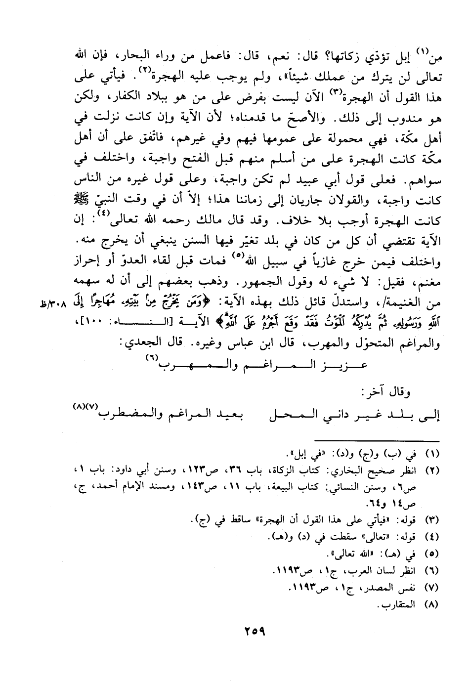 من إبل تؤدي زكاتها؟ قال: نعم، قال: فاعمل من وراء البحار، فإن الله تعالى لن يترك من عملك شيئًا))، ولم يوجب عليه الهجرة. فيأتي على هذا القول أن الهجرة الآين ليست بفرض على من هو ببلاد الكفار، ولكن هو مندوب إلى ذلك. والأصح ما قدمناه؛ لأن الآية وإن كانت نزلت في أهل مكة، فهي محمولة على عمومها فيهم وفي غيرهم، فاتفق على أن أهل مكة كانت الهجرة على من أسلم منهم قبل الفتح واجبة، واختلف في سواهم. فعلى قول أبي عبيد لم تكن واجبة، وعلى قول غيره من الناس كانت واجبة، والقولان جاريان إلى زماننا هذا؛ إلا أن في وقت النبي صلى الله عليه وسلم كانت الهجرة أوجب بلا خلاف. وقد قال مالك رحمه الله تعالى: إن الآية تقتضي أن كل من كان في بلد تغير فيها السنن ينبغي أن يخرج منه.