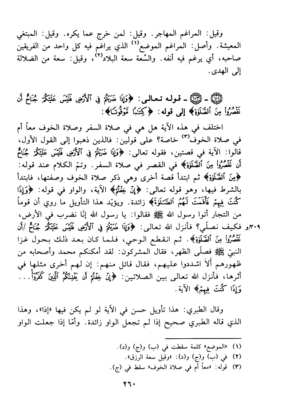 اختلف في هذه الآية هل هي في صلاة السفر وصلاة الخوف معًا أم في صلاة الخوف خاصة؟ على قولين: فالذين ذهبوا إلى القول الأول قالوا: الآية في قصتين، فقوله تعالى: {وإذا ضربتم في الأرض فليس عليكم جناح أن تقصروا من الصلاة} ثم ابتدأ قصة أخرى وهي ذكر صلاة الخوف وصفتها، فابتدأ بالشرط فيها، وهو قوله تعالى: {إن خفتم} الآية، والواو في قوله: {وإذا كنت فيهم فأقمت لهم الصلاة} زائدة. ويؤيد هذا التأويل ما روي أن قومًا من التجار أتوا رسول الله صلى الله عليه وسلم فقالوا: يا رسول الله إنا نضرب في الأرض، فكيف نصلي؟ فأنزل الله تعالى: {وإذا ضربتم في الأرض فليس عليكم جناح أن تقصروا من الصلاة}. ثم انقطع الوحي، فلما كان بعد ذلك بحول غزا النبي صلى الله عليه وسلم فصلى الظهر، فقال المشركون: لقد أمكنكم محمد وأصحابه من ظهورهم أل فشددوا عليهم، فقال قائل منهم: إن لهم أخرى مثلها على أثرها، فأنزل الله تعالى بين الصلاتين: {إن خفتم أن يفتنكم الذين كفروا ... وإذا كنت فيهم} الآية.
