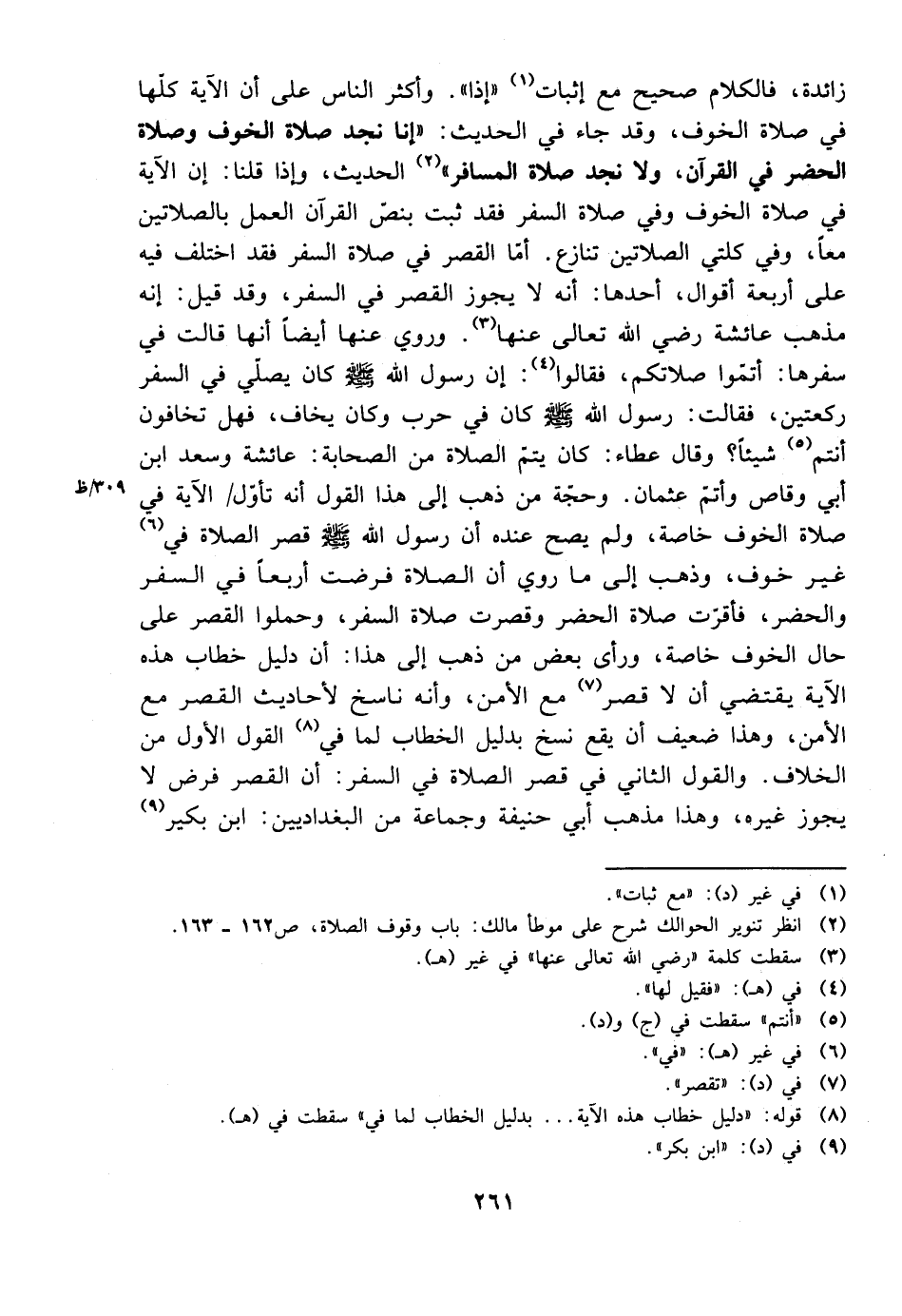 زائدة، فالكلام صحيح مع إثبات ((إذا)). وأكثر الناس على أن الآية كلها في صلاة الخوف، وقد جاء في الحديث: ((إنا نجد صلاة الخوف وصلاة الحضر في القرآن، ولا نجد صلاة المسافر)) الحديث، وإذا قلنا: إن الآية في صلاة الخوف وفي صلاة السفر فقد ثبت بنص القرآن العمل بالصلاتين معًا، وفي كلتي الصلاتين تنازع. وأما القصر في صلاة السفر فقد اختلف فيه على أربعة أقوال، أحدها: أنه لا يجوز القصر في السفر، وقد قيل: إنه مذهب عائشة رضي الله تعالى عنها. وروي عنها أيضًا أنها قالت في سفرها: أتموا صلاتكم، فقالوا: إن رسول الله صلى الله عليه وسلم كان يصلي في السفر ركعتين، فقالت: رسول الله صلى الله عليه وسلم كان في حرب وكان يخاف، فهل أنتم تخافون شيئًا؟ وقال عطاء: كان يتم الصلاة من الصحابة: عائشة وسعد بن أبي وقاص وأتم عثمان. وحجة من ذهب إلى هذا القول أنه تأول الآية في صلاة الخوف خاصة، ولم يصح عنده أن رسول الله صلى الله عليه وسلم قصر الصلاة في غير خوف، وذهب إلى ما روي أن الصلاة فرضت أربعًا في السفر والحضر، فأقرت صلاة الحضر وقصرت صلاة السفر، وحملوا القصر على حال الخوف خاصة، ورأى بعض من ذهب إلى هذا: أن دليل خطاب هذه الآية يقتضي أن لا قصر مع الأمن، وأنه ناسخ لأحاديث القصر مع الأمن، وهذا ضعيف أن يقع نسخ بدليل الخطاب لما في القول الأول من الخلاف. والقول الثاني في قصر الصلاة في السفر: أن القصر فرض لا يجوز غيره، وهذا مذهب أبي حنيفة وجماعة من البغداديين: ابن بكير