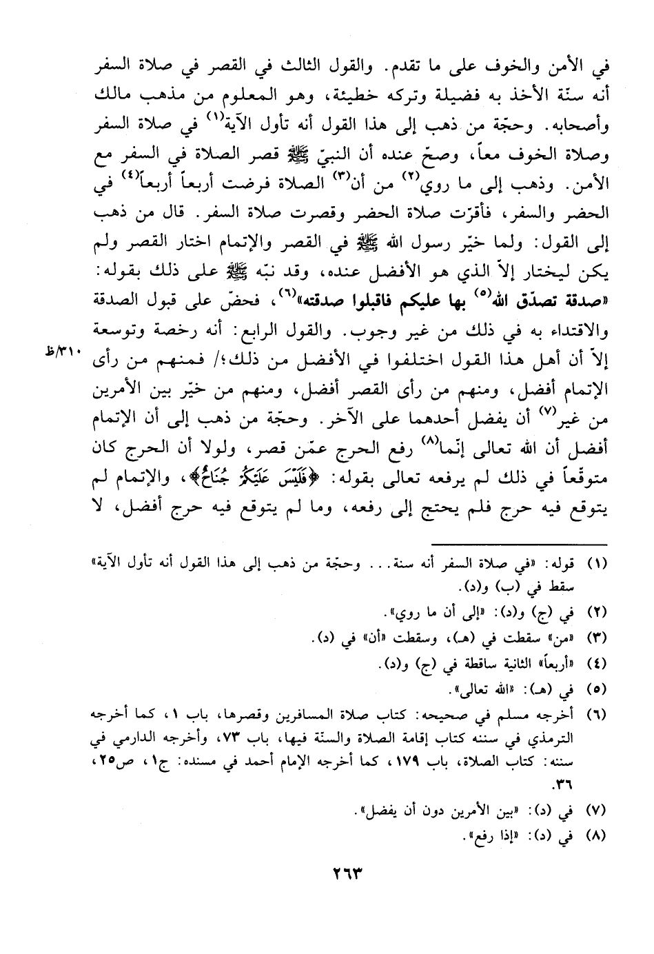 في الأمن والخوف على ما تقدم. والقول الثالث في صلاة السفر أنه سنة الأخذ به فضيلة وتركه خطيئة، وهو المعلوم من مذهب مالك وأصحابه. وحجة من ذهب إلى هذا القول أنه تأول الآية في صلاة السفر والخوف معًا، وصح عنده أن النبي صلى الله عليه وسلم قصر الصلاة في السفر مع الأمن. وذهب إلى ما وري من أن الصلاة فرضت أربعًا أربعًا في الحضر والسفر، فأقرت صلاة الحضر وقصرت صلاة السفر. قال من ذهب إلى القول: لوما خير رسول الله صلى الله عليه وسلم في القصر والإتمام اختار القصر ولم يكن ليختار إلا الذي هو الأفضل عنده، وقد نبه صلى الله عليه وسلم بقوله: ((صدقة تصدق الله بها عليكم فاقبلوا صدقته))، فحض على قبول الصدقة والاقتداء به في ذلك من غير وجوب. والقول الرابع: أنه رخصة وتوسعة إلا أن أهل هذا القول اختلفوا في الأفضل من ذلك؛ فمنهم من رأى الإتمام أفضل، ومنهم من رأى القصر أفضل، ومنهم من ذهب إلى أ، الإتمام أفضل أن الله تعالى إنما رفع الحرج عمن قصر، ولولا أن الحرج كان متوقعًا في ذلك لم يرفعه تعالى بقوله: {فليس عليكم جناح}، والإتمام لم يتوقع فيه حرج فلم يحتج إلى رفعه، وما لم يتوقع فيه حرج أفضل، لا