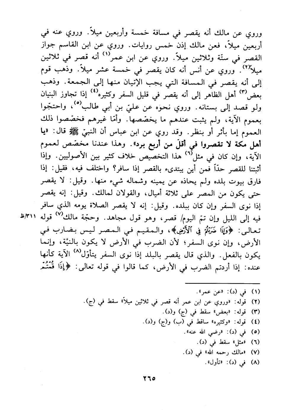 وروي عن مالك أنه يقصر في مسافة خمسة وأربعين ميلًا. وروي عنه في أربعين ميلًا، فعن مالك إذن خمس روايات. وروي عن ابن القاسم جواز القصر في ستة وثلاثين ميلًا. وروي عن ابن عمر أنه قصر في ثلاثين ميلًا. وروي عن أنس أنه كان يقصر في خمسة عشر ميلًا. وذهب قوم إلى أنه يقصر في المسافة التي يجب الإتيان منها إلى الجمعة. وذهب يعض أهل الظاهر إلى أنه يقصر في قليل السفر وكثيره إذا تجاوز البنيان ولو قصد إلى بستانه. وروي نحوه عن علي بن أبي طالب، واحتجوا بعموم الآية، ولم يثبت عندهم ما يخصصها. وأما غيرهم فخصصوا ذلك العموم إما بأثر أو بنظر. وقد روي عن ابن عباس أن النبي صلى الله عليه وسلم قال: ((يا أهل مكة لا تقصروا في أقل من أربع برد)). وهذا عندنا مخصص لعموم الآية، وإن كان في مثل هذا التخصيص خلاف كثير بين الأصوليين. وإذا أثبتنا للقصر حدًا فمن أين يبتدئ بالقصر إذا سافر؟ واختلف فيه، فقيل: إذا فارق بيوت بلده ولم يحاذه عن يمينه وشماله شيء منها. وقيل: إنه يقصر إذا نوى السفر وإن كان ببلده. وقيل: إنه لا يقصر الصلاة يومه الذي سافر فيه إلى الليل وإن تم اليوم قصر، وهو قول مجاهد. وحجة مالك قوله تعالى: {وإذا ضربتم في الأرض}، والمقيم في المصر لا يكون بالنية، وإنما يكون بالفعل. والذي قال يقصر بالبلد إذا نوى السفر يتأول الآية كأنها عنده: إذا أردتم الضرب في الأرض، كما قالوا في قوله تعالى: {إذا قمتم