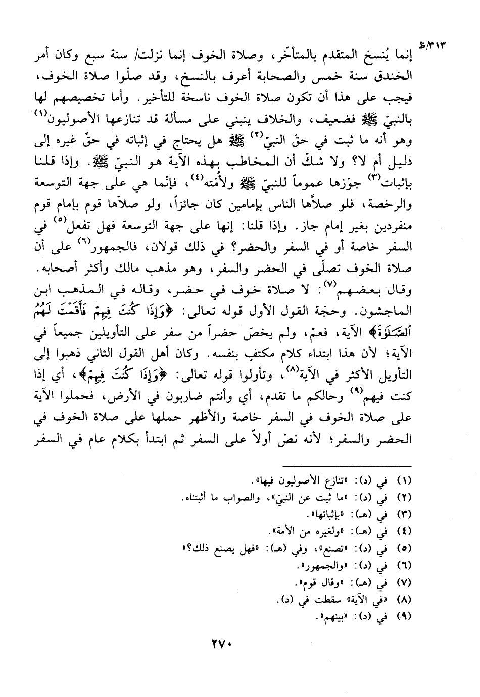 إنما ينسخ المتقدم بالمتأخر، وصلاة الخوف إنما نزلت سنة سبع وكان أمر الخندق سنة خمس والصحابة أعرف بالنسخ، وقد صلوا صلة الخوف، فيجب على هذا أن تكون صلاة الخوف ناسخة للتأخير. وأما تخصيصهم لها بالنبي صلى الله عليه وسلم فضعيف، والخلاف ينبني على مسألة قد تنازعها الأصوليون وهو أنه ما ثبت في حق النبي صلى الله عليه وسلم هل يحتاج إثباته في حق غيره إلى دليل أم لا؟ ولا شك أن المخاطب بهذه الآية هو النبي صلى الله عليه وسلم. وإذا قلنا بإثبات جوزها عمومًا للنبي صلى الله عليه وسلم ولأمته، فإنما هي على جهة التوسعة والرخصة، فلو صلاها الناس بإمامين كان جائزًا، ولو صلاها قوم بإمام قوم منفردين بغير إمام جاز. وإذا قلنا: إنها على جهة التوسعة فهل تفعل في السفر خاصة أو في السفر والحضر؟ في ذلك قولان، فالجمهور على أن صلاة الخوف تصلى في الحضر والسفر، وهو مذهب مالك وأكثر أصحابه.