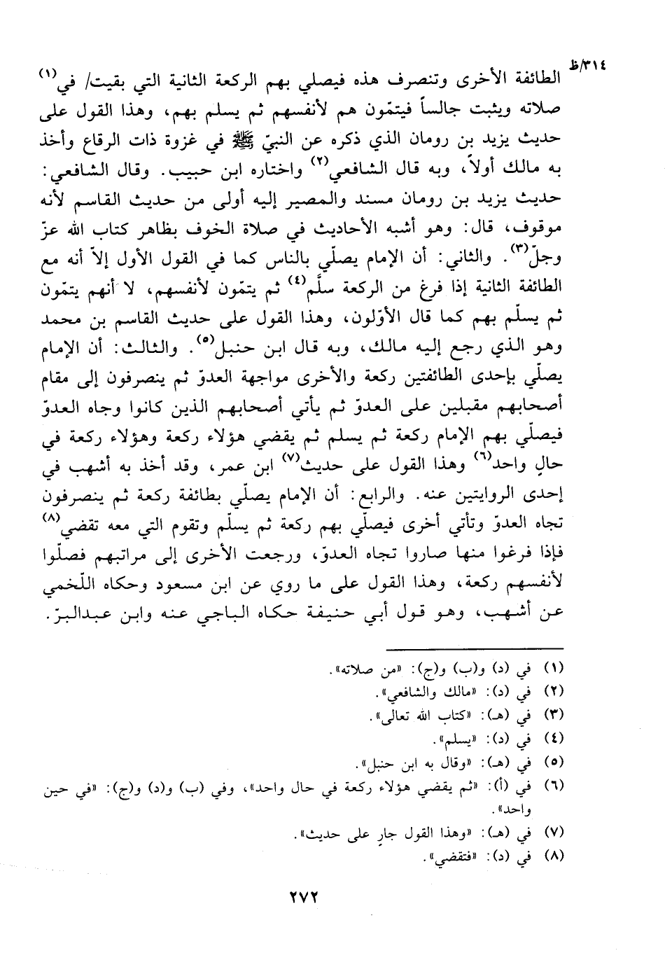 الطائفة الأخرى وتنصرف هذه فيصلي بهم الركعة الثانية التي بقيت في صلاته ويثبت جالسًا فيتمون هم لأنفسهم ثم يسلم بهم، وهذا القول على حديث يزيد بن رومان الذي ذكره عن النبي صلى الله عليه وسلم في غزوة ذات الرقاع وأخذ به مالك أولًا، وبه قال الشافعي واختاره ابن حبيب. وقال الشافعي: حديث يزيد بن رومان مسند والمصير إليه أولى من حديث القاسم لأنه موقوف، قال: وهو أشبه الأحاديث في صلاة الخوف بظاهر كتاب الله عز وجل. والثاني: أن الإمام يصلي بالناس كما في القول الأول إلا أنه مع الطائفة الثانية إذا فرغ من الركعة الثانية سلم ثم يتمون لأنفسهم، لا انهم يتمون ثم يسلم بهم كما قال الأولون، وهذا القول على حديث القاسم بن محمد وهو الذي رجع إليه مالك، وبه قال ابن حنبل. والثالث: أن الإمام يصلي بإحدى الطائفتين ركعة والأخرى مواجهة العدو ثم ينصرفون إلى مقام أصحابهم مقبلين على العدو ثم يأتي أصحابهم الذين كانوا وجاه العدو فيصلي بهم الإمام ركعة ثم يسلم ثم يقضي هؤلاء ركعة وهؤلاء ركعة في حال واحد وهذا القول على حديث ابن عمر، وقد أخذ به أشهب في إحدى الروايتين عنه. والرابع: أن الإمام يصلي بطائفة ركعة ثم ينصرفون تجاه العدو وتأتي أخرى فيصلي بهم ركعة ثم يسلم وتقوم التي معه تقضي فإذا فرغوا منها صاروا تجاه العدو، ورجعت الأخرى إلى مراتبهم فصلوا لأنفسهم ركعة، وهذا القول على ما روي عن ابن مسعود وحكاه اللخمي عن أشهب، وهو قول أبي حنيفة حكاه الباجي عنه وابن عبد البر.