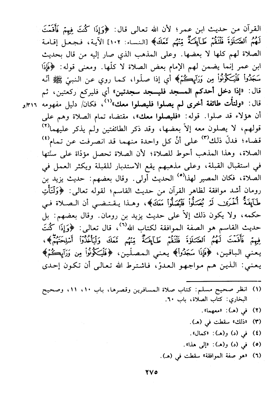 القرآن من حديث ابن عمر؛ لأن الله تعالى قال: {وإذا كنت فيهم فأقمت لهم الصلاة فلتقم طائفة منهم معك} [النساء: 102] الآية، فجعل إقامة الصلاة لهم كلها لا بعضها. وعلى المذهب الذي صار إليه من قال بحديث ابن عمر إنما يضمن لهم الإمام بعض الصلاة لا كلها. ومعنى قوله: {فإذا سجدوا فليكونوا من ورائكم} أي إذا صلوا، كما روي عن النبي صلى الله عليه وسلم أنه قال: ((إذا دخل أحدكم المسجد فليسجد سجدتين)) أي فليركع ركعتين، ثم قال: ((ولتأت طائفة أخرى لم يصلوا فليصلوا معك))، فكان دليل مفهومه أن هؤلاء قد صلوا. وقوله: ((فليصلوا معك))، مقتضاه تمام الصلاة وهم على قولهم، ولا يصلون معه إلا بعضها، وقد ذكر الطائفتين ولم يذكر عليهما قضاء؛ فدل ذلك على أن كل واحدة منهما قد انصرفت عن تمام الصلاة، وهذا المذهب أحوط للصلاة؛ لأن الصلاة تحصل مؤداة على سنتها في استقبال القبلة، وعلى مذهبهم يقع الاستدبار للقبلة ويكثر العمل في الصلاة، فكان المصير لهذا الحديث أولى. وقال بعضهم: حديث يزيد بن رومان أشد موافقة لظاهر القرآن من حديث القاسم؛ لقوله تعالى: {ولتأت طائفة أخرى لم يصلوا فليصلوا معك}، وهذا يقتضي أن الصلاة في حكمه، ولا يكون ذلك إلا على حديث يزيد بن رومان. وقال بعضهم: بل حديث القاسم هو الصفة الموافقة لكتاب الله، قال تعالى: {وإذا كنت فيهم فأقمت لهم الصلاة فلتقم طائفة منهم معك وليأخذوا أسلحتهم}، يعني الباقين، {فإذا سجدوا} يعني المصلين، {فليكونوا من ورائكم} يعني: الذين هم مواجهو العدو، فاشترط الله تعالى أن تكون إحدى