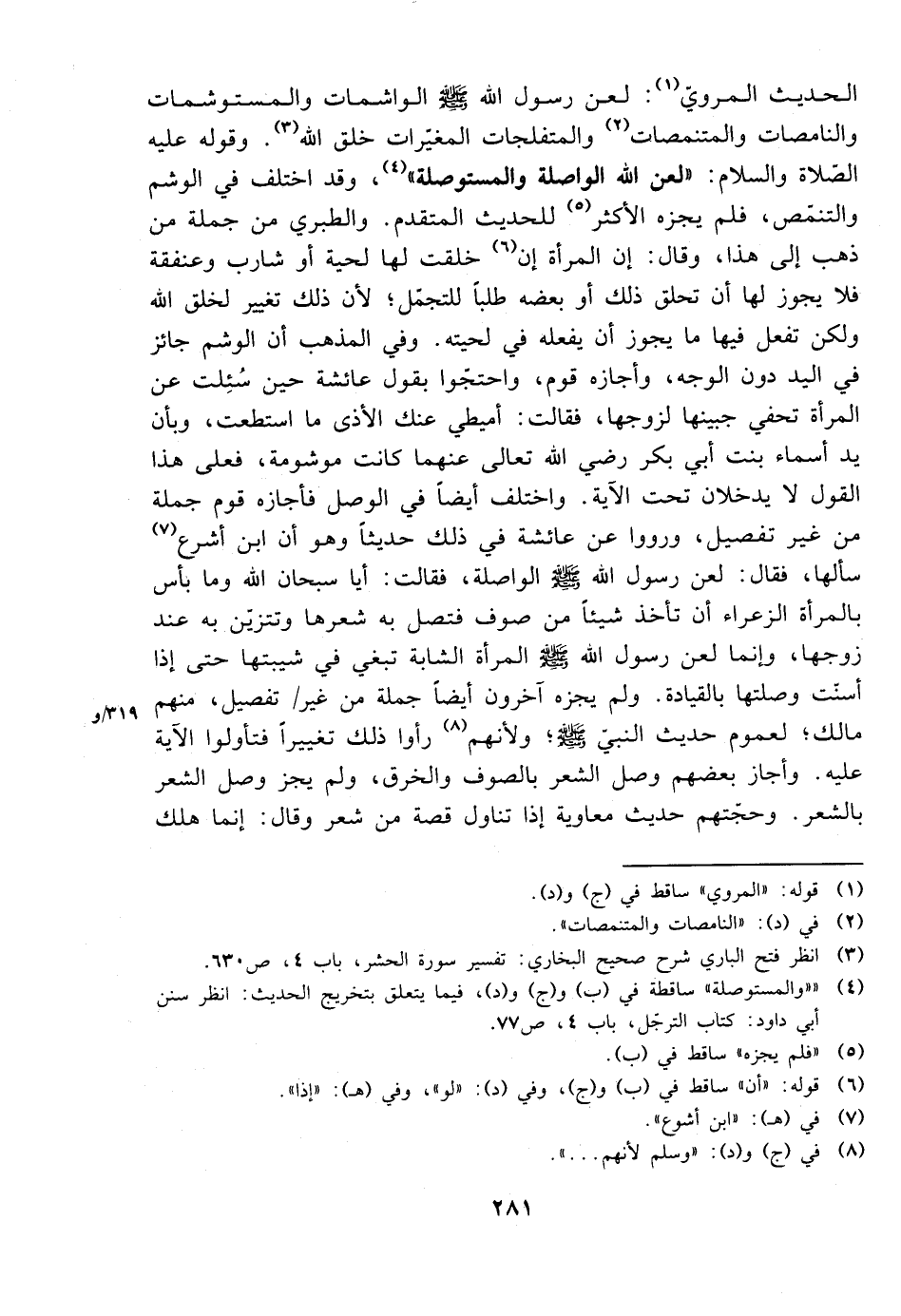 الحديث المروي: لعن رسول الله صلى الله عليه وسلم الواشمات والمستوشمات والنامصات والمتنمصات والمتفلجات المغيرات خلق الله. وقوله علي الصلاة والسلام: ((لعن الله الواصلة والمستوصلة))، وقد اختلف في الوشم والتنمص، فلم يجزه الأكثر للحديث المتقدم. والطبري من جملة من ذهب إلى هذا، وقال: إن المرأة إن خلقت لها لحية او شارب أو عنفقة فلا يجوز لها أن تحلق ذلك أو بعضه طلبًا للتجمل؛ لأن ذلك تغيير لخلق الله ولكن تفعل ما يجوز أن يفعله في لحيته. وفي المذهب أن الوشم جائز في اليد دون الوجه، وأجازه قوم، واحتجوا بقول عائشة حين سئلت عن المرأة تحفي جبينها لزوجها، فقالت: أميطي عنك الأذى ما استطعت، وبأن يد أسماء بنت أبي بكر رضي الله تعالى عنهما كانت موشومة، فعلى هذا القول لا يدخلان تحت الآية. واختلف أيضًا في الوصل فأجازه قوم جملة من غير تفصيل، ورووا عن عائشة في ذلك حديثًا وهو أن ابن أشرع سألها، فقال: لعن رسول الله صلى الله عليه وسلم الواصلة، فقالت: أيا سبحان اللع وما بأس بالمرأة الزعراء أن تأخذ شيئًا من صوف فتصل به شعرها وتتزين به عند زوجها، وإنما لعن رسول الله صلى الله عليه وسلم المرأة الشابة تبغي في شيبتها حتى إذا أسنت وصلتها بالقيادة. ولم يجزه آخرون أيضًا جملة من غير تفصيل، منهم مالك؛ لعموم حديث النبي صلى الله عليه وسلم، ولأنهم رأوا ذلك تغييرًا فتأولوا الآية عليه. وأجاز بعضهم وصل الشعر بالصوف والخرق، ولم يجز وصل الشعر بالشعر. وحجتهم حديث معاوية إذا تناول قصة من شعر وقال: إنما هلك