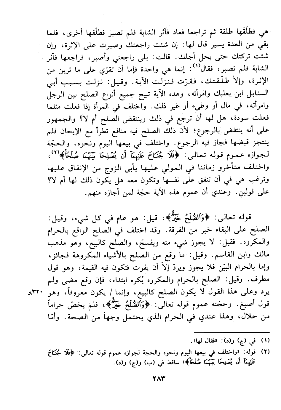 وقوله تعالى: {والصلح خير}، قيل: هو عام في كل شيء، وقيل: الصلح على البقاء خير من الفرقة. وقد اختلف في الصلح الواقع بالحرام والمكروه. فقيل: لا يجوز شيء منه ويفسخ، والصلح كالبيع، وهو مذهب مالك وابن القاسم. وقيل: ما وقع من الصلح بالأشياء المكروهة فجائز، وإما بالحرام البين فلا يجوز ويرد إلى أن يفوت فتكون فيه القيمة، وهو قول مطرف. وقيل: الصلح بالحرام والمكروه يكره ابتداء، فإن وقع مضى ولم يرد وعلى هذا القول لا يكون الصلح كالبيع، وإنما يكون معروفًا، وهو قول أصبغ. وحجته عموم قوله تعالى: {والصلح خير}، فمل يخص حرامًا من حلال، وهذا عندي في الحرام الذي يحتمل وجهًا من الصحة. وأما