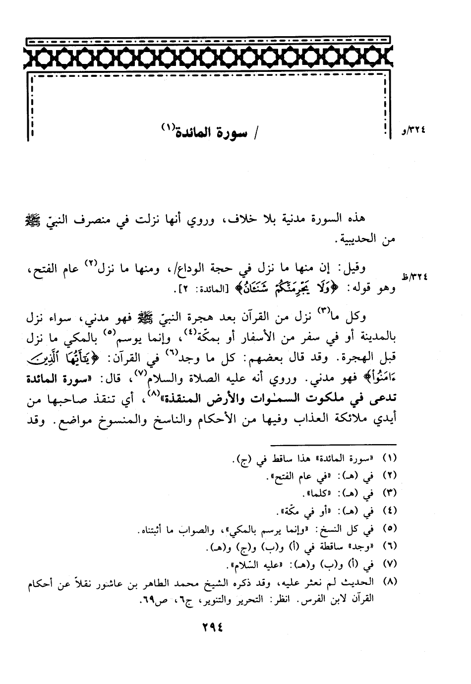 وكل ما نزل من القرآن بعد هجرة النبي صلى الله عليه وسلم فهو مدني، سواء نزل بالمدينة أو في سفر من الأسفار أو بمكة، وإنما يوسم بالمكي ما نزل قبل الهجرة. وقد قال بعضهم: كل ما وجد في القرآن: {يا أيها الذين آمنوا} فهو مدني. وروي أنه عليه الصلاة والسلام، قال: ((سورة المائدة تدعى في ملكوت السماوات والأرض المنقدة))، أي تنقذ صاحبها من أيدي ملائكة العذاب وفيها من الأحكام والناسخ والمنسوخ مواضع. وقد