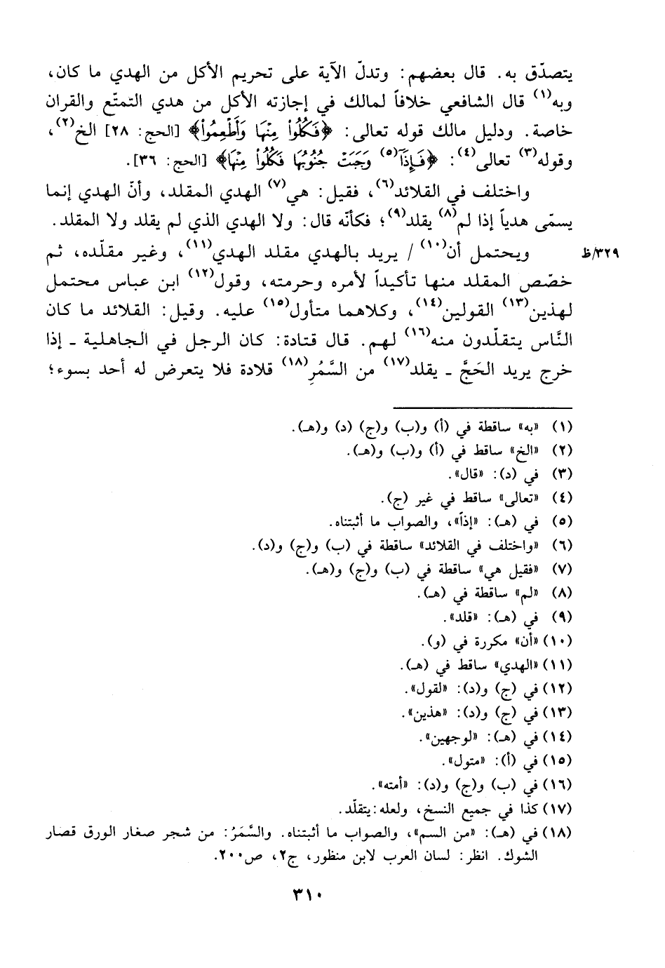 ويحتمل أن يريد بالهدي مقلد الهدي، وغير مقلده، ثم خصص المقلد منها تأكيدًا لأمره وحرمته، وقول ابن عباس محتمل لهذين القولين، وكلاهما متأول عليه. وقيل: القلائد ما كان الناس يتقلدون منه لهم. قال قتادة: كان الرجل في الجاهلية -إذا خرج يريد الحج- يقلد من السمر قلادة فلا يتعرض له أحد بسوء؛