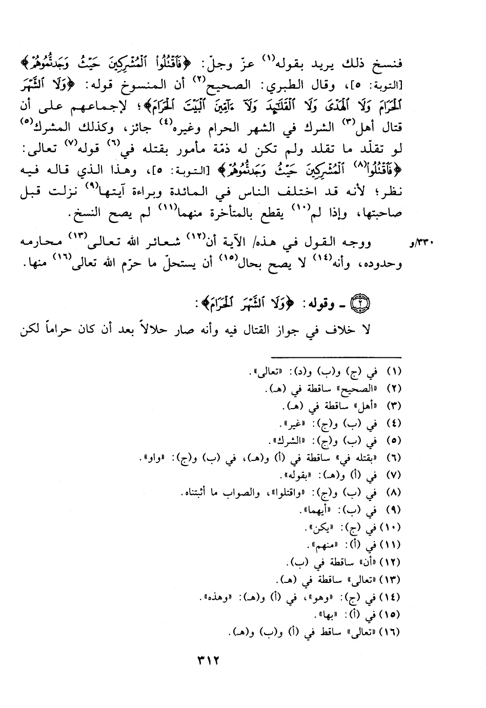 فنسخ ذلك يريد بقوله عز وجل: {فاقتلوا المشركين حيث وجدتموهم} [التوبة: 5]، وقال الطبري: الصحيح أن المنسوخ قوله: {ولا الشهر الحرام ولا الهدي ولا القلائد ولا آمين البيت الحرام}؛ : لإجماعهم على أن قتال أهل الشرك في الشهر الحرام وغيره جائز، وكذلك المشرك لو تقلد ما تقلد ولم تكن له ذمة مأمور بقتله في قوله تعالى: {فاقتلوا المشركين حيث وجدتموهم} [التوبة: 5]، وهذا الذي قاله فيه نظر؛ لأنه قد اختلف الناس في المائدة وبراءة آيتها نزلت قبل صاحبتها، وإذا لم يقطع بالمتأخرة منهما لم يصح النسخ.