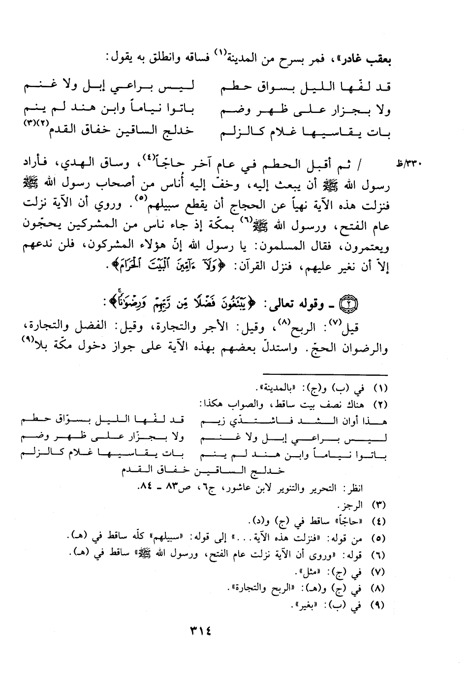 ثم أقبل الحطم في عام آخر حاجًا، وساق الهدي، فأراد رسول الله صلى الله عليه وسلم أن يبعث إليه، وخف إليه أناس من أصحاب رسول الله صلى الله عليه وسلم فنزلت الآية نهيًا عن الحجاج أن يقطع سبيلهم. وروي أن الآية نزلت عام الفتح، ورسول الله صلى الله عليه وسلم بمكة إذ جاء ناس من المشركين يحجون ويعتمرون، فقال المسلمون: يا رسول الله إن هؤلاء المشركون، فلن ندعهم إلا أن نغير عليهم، فنزل القرآن: {ولا آمين البيت الحرام}.