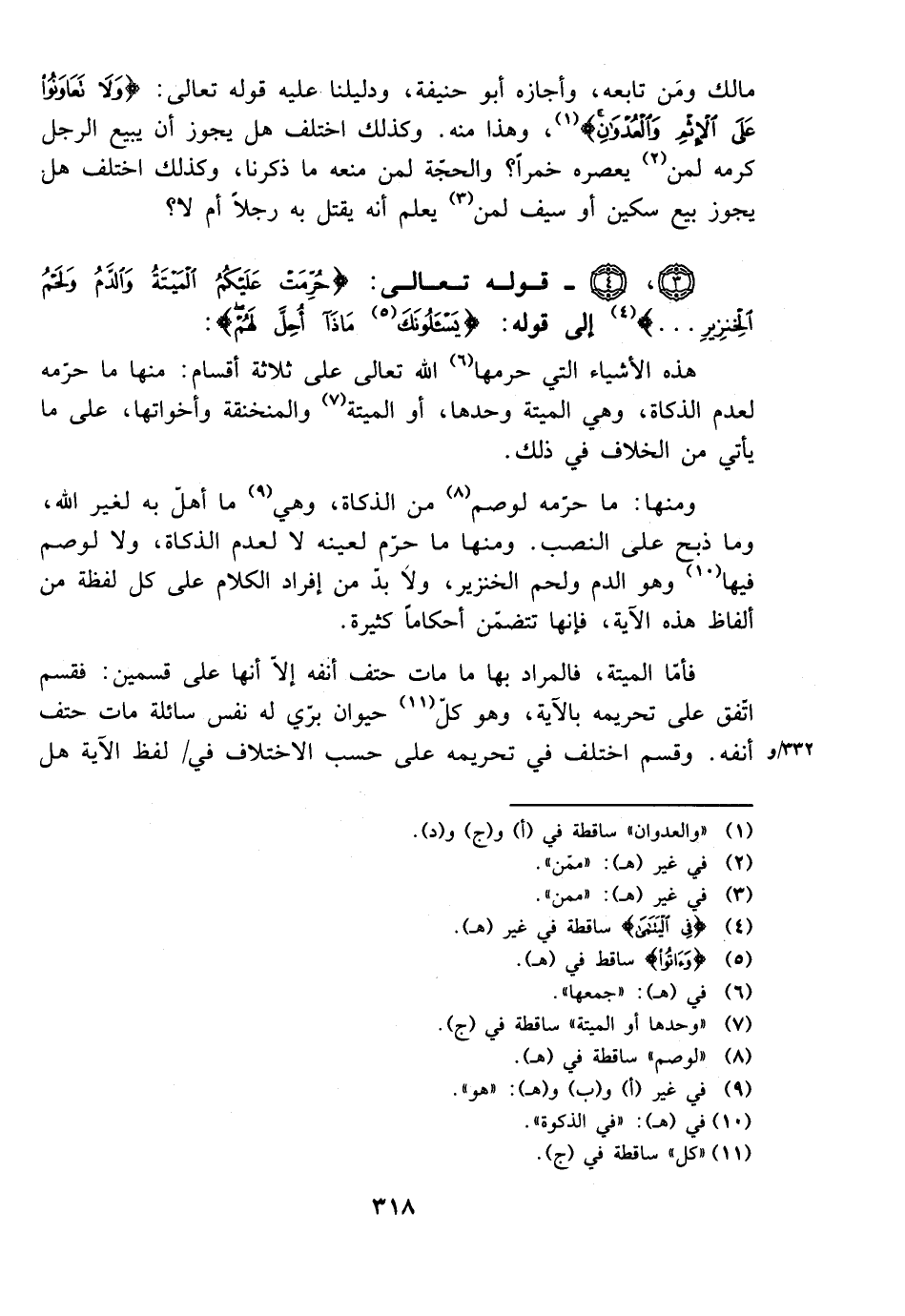 ومنها: ما حرمه لوصم من الذكاة، وهي ما أهل به لغير الله، وما ذبح على النصب. ومنها ما حرم لعينه لا لعدم الذكاة، ولا لوصم فيها وهو الدم ولحم الخنزير، ولا بد من إفراد الكلام على كل لفظة من ألفاظ هذه الآية، فإنها تتضمن أحكامًا كثيرة.