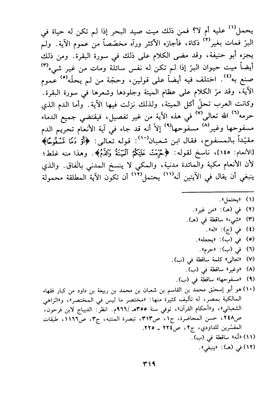 يحمل عليه أم لا؟ فمن ذلك ميت صيد البحر إذا لم تكن له حياة في البر فمات بغير ذكاة، فأجازه الأكثر ورآه مخصصًا من عموم الآية. ولم يجزه أبو حنيفة، وقد مضى الكلام على ذلك في سورة البقرة. ومن ذلك أيضًا ميت حيوان البر إذا لم تكن له نفس سائلة ومات من غير شيء صنع به. واختلف فيه أيضًا على قولين، وحجة من لم يحله عموم الآية، وقد مر الكلام على عظام الميتة وجلودها وشعرها في سورة البقرة.