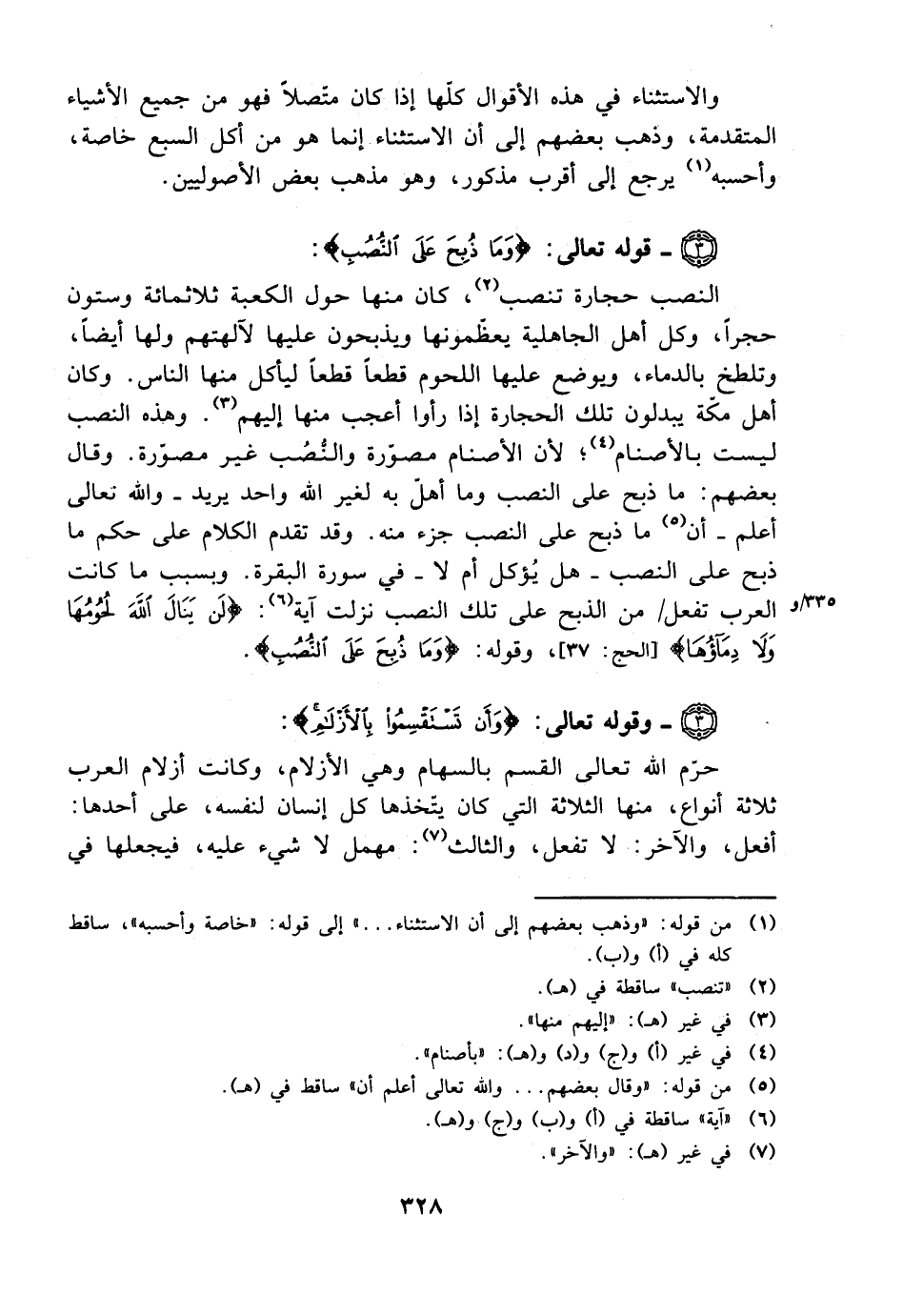 النصب حجارة تنصب، كان منها حول الكعبة ثلاثمائة وستون حجرًا، وكل أهل الجاهلية يعظمونها ويذبحون عليها لآلهتهم ولها أيضًا، وتلطخ بالدماء، ويوضع عليها اللحوم قطعًا قطعًا ليأكل منها الناس. وكان أهل مكة يبدلون تلك الحجارة إذا رأوا أعجب منها إليهم. وهذه النصب ليست بالأصنام؛ لأن الأصنام مصورة والنصب غير مصورة. وقال بعضهم: ما ذبح على النصب وما أهل به لغير الله واحد يريد -والله تعالى أعلم- أن ما على النصب جزء منه. وقد تقدم الكلام على حكم ما ذبح على النصب -هل يؤكل أم لا- في سورة البقرة. وبسبب ما كانت العرب تفعل من الذبح على تلك النصب نزلت آية: {لن ينال الله لحومها ولا دماؤها} [الحج: 37]، وقوله: {وما ذبح على النصب}.