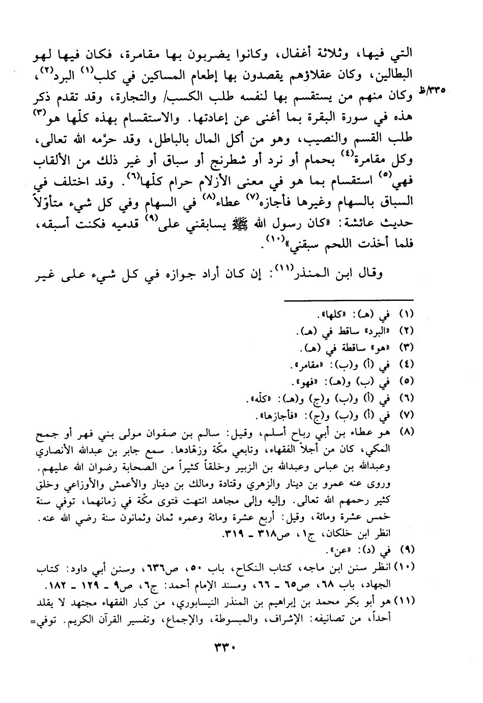 التي فيها، وثلاثة أغفال، وكانوا يضربون بها مقامرة، فكان فيها لهو البطالين، وكان عقلاؤهم يقصدون بها إطعام المساكين في كلب البرد، وكان منهم من يستقسم بها لنفسه طلب الكسب والتجارة، وقد تقدم ذكر هذه في سورة البقرة بما أغنى عن إعادتها. والاستقسام بهذه كلها هو طلب القسم والنصيب، وهو من أكل المال بالباطل، وقد حرمه الله تعالى، وكل مقامرة بحمام أو نرد أو شطرنج أو سباق أو غير ذلك من الألقاب فهي استقسام بما هو في معنى الأزلام حرام كلها. وقد اختلف في السباق بالسهام وغيرها فأجازه عطاء في السهام وفي كل شيء متأولًا حديث عائشة: ((كان رسول الله صلى الله عليه وسلم يسابقني على قدميه فكنت أسبقه، فلا أخذت اللحم سبقني)).