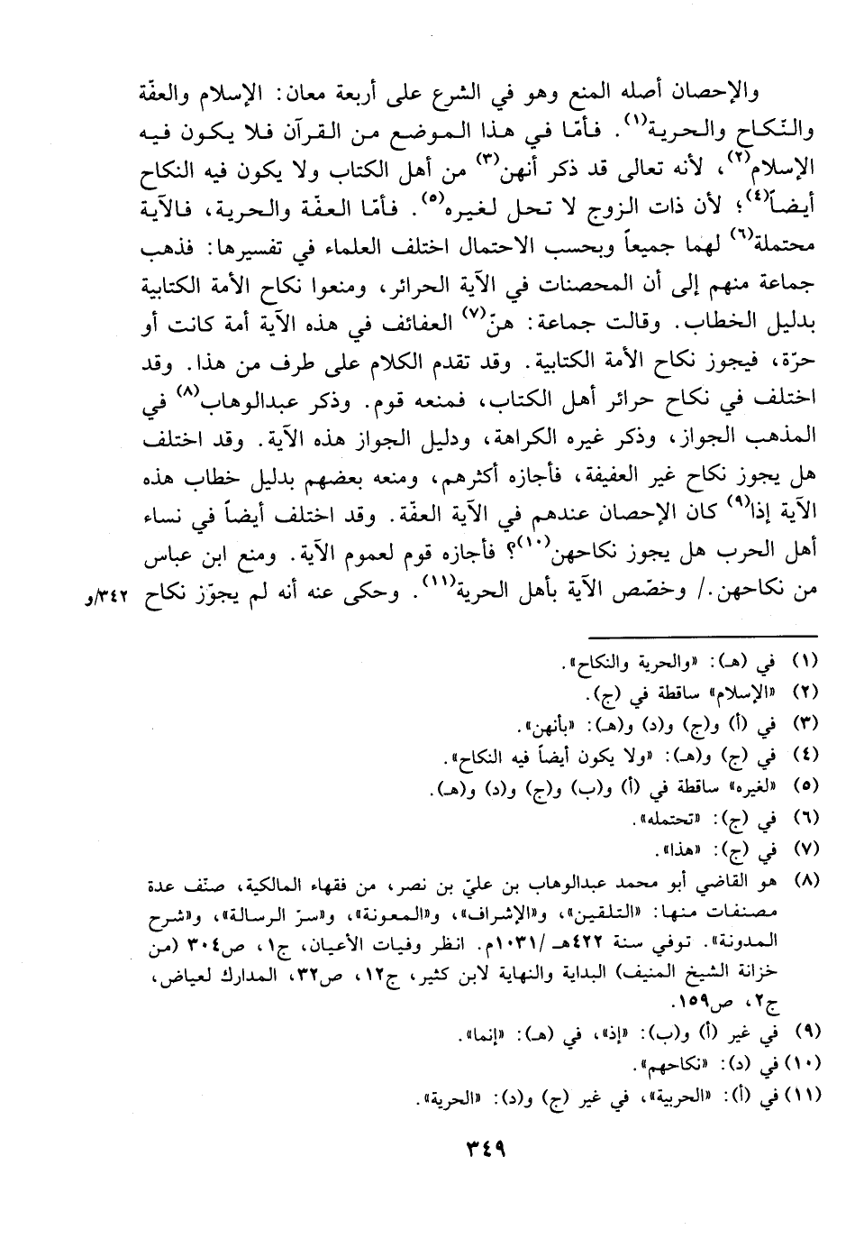 والإحصان أصله المنع وهو في الشرع على أربعة معان: الإسلام والعفة والنكاح والحرية. فأما في هذا الموضع من القرآن فلا يكون فيه الإسلام، لأنه تعالى قد ذكر أنهن من أهل الكتاب ولا يكون فيه النكاح أيضًا؛ لأن ذات الزوج لا تحل لغيره. فأما العفة والحرية، فالآية محتملة لهما جميعًا وبحسب الاحتمال اختلف العلماء في تفسيرها: فذهب جماعة منهم إلى أن المحصنات في الآية الحرائر، ومنعوا نكاح الكتابية بدليل الخطاب. وقالت جماعة: عن العفائف في هذه الآية أمة كانت أو حرة، فيجوز نكاح الأمة الكتابية. وقد تقدم الكلام على طرف من هذا. وقد اختلف في نكاح حرائر أهل الكتاب، فمنعه قوم. وذكر عبد الوهاب في المذهب الجواز، وذكر غيره الكراهة، ودليل الجواز هذه الآية. وقد اختلف هل يجوز نكاح غير العفيفة، فأجازه أكثرهم، ومنعه بعضهم بدليل خطاب هذه الآية إذا كان الإحصان عندهم في الآية العفة. وقد اختلف أيضًا في نساء أهل الحرب هل يجوز نكاحهن؟ فأجازه قوم لعموم الآية. ومنع ابن عباس من نكاحهن. وخصص الآية بأهل الحرية. وحكى عنه أنه لم يجوز نكاح