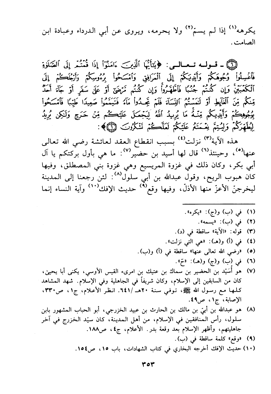 هذه الآية نزلت بسبب انقطاع العقد لعائشة رضي الله تعالى عنها، حينئذ قال لها أسيد بن حضير: ما هي بأول بركتكم يا آل أبي بكر، وكان في غزوة المريسيع وهي غزوة بني المصطلق، وفيها كان هبوب الريح، وقول عبد الله بن أبي سلول: لئن ر جعنا إلى المدينة ليخرجن الأعز منها الأذل، وفيها وقع حديث الإفك وآية النساء إنما