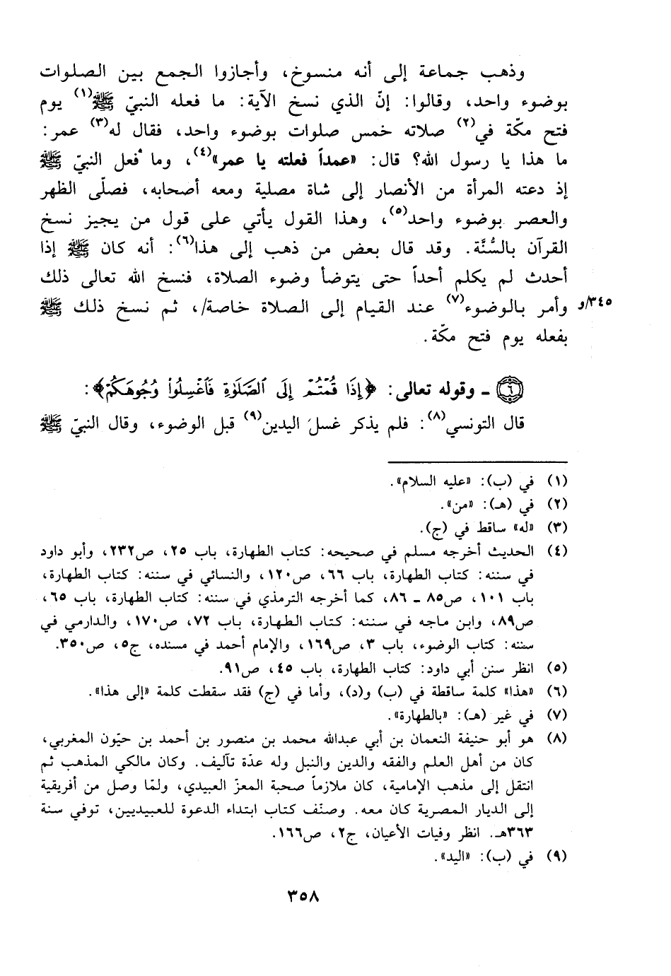 وذهب جماع إلى أنه منسوخ، وأجازوا الجمع بين الصلوات بوضوء واحد، وقالوا: إن الذي نسخ الآية ما فعله النبي صلى الله عليه وسلم يوم فتح مكة في صلاته خمس صلوات بوضوء واحد، فقال له عمر: ما هذ يا رسول الله؟ قال: ((عمدًا فعلته يا عمر))، وما فعل النبي صلى الله عليه وسلم إذ دعته المرأة من الأنصار إلى شاة مصلية ومعه أصحابه، فصلى الظهر والعصر بوضوء واحد، وهذا القول يأتي على قول من يجيز نسخ القرآن بالسنة. وقد قال بعض من ذهب إلى هذا: أنه كان صلى الله عليه وسلم إذا أحدث لم يكلم أحدًا حتى يتوضأ وضوء الصلاة، فنسخ الله تعالى ذلك وأمر بالوضوء عند القيام إلى الصلاة خاصة، ثم نسخ ذلك صلى الله عليه وسلم بفعله يوم فتح مكة.