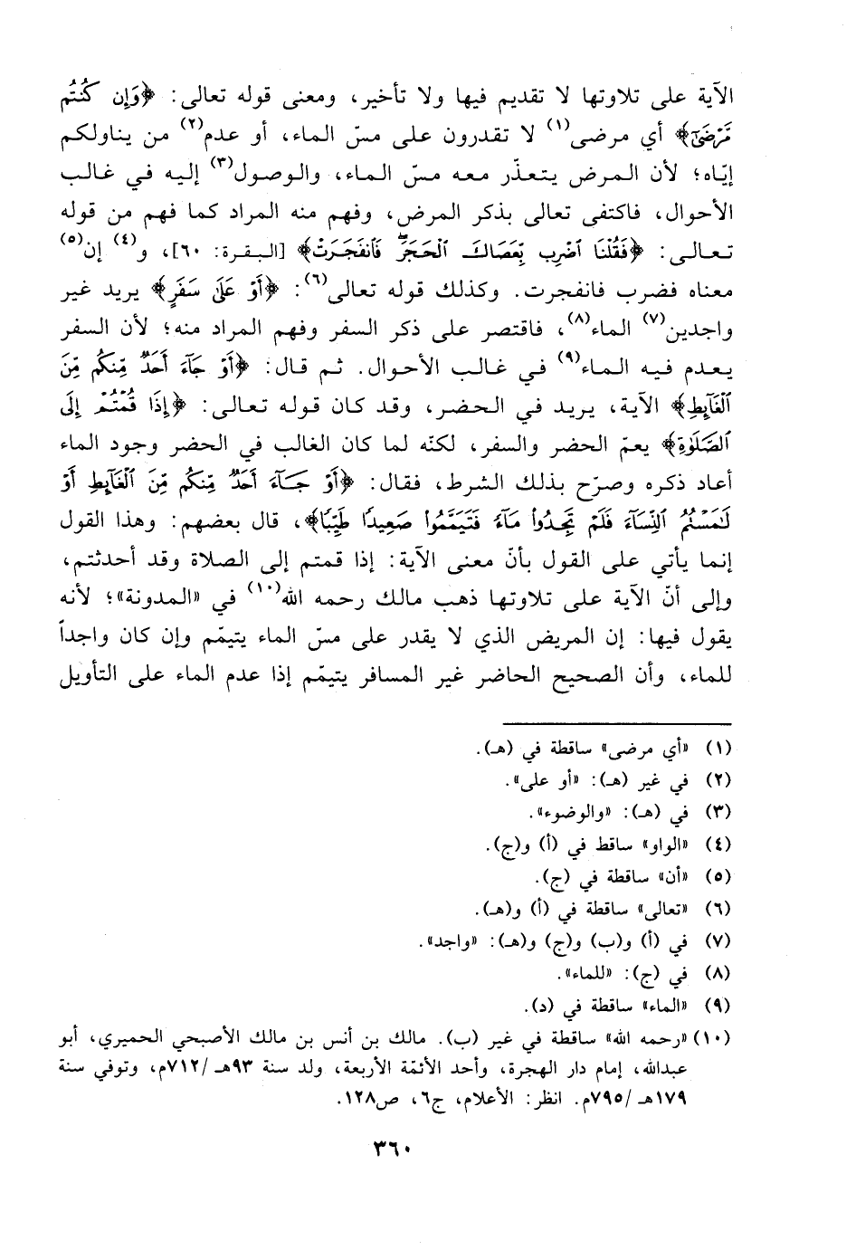 الآية على تلاوتها لا تقديم فيها ولا تأخير، ومعنى قوله تعالى: {وإن كنتم مرضى} أي مرضى لا تقدرون على مس الماء، أو عدم من يناولكم إياه؛ لأن المرض يتعذر معه مس الماء، والوصول إليه في غالب الأحوال، فاكتفى تعالى بذكر المرض، وفهم منه المراد كما فهم من قوله تعالى: {فقلنا اضرب بعصاك الحجر فانفجرت} [البقرة: 60]، وإن معناه فضرب فانفجرت. وكذلك قوله تعالى: {أو على سفر} يريد غير واجدين الماء، فاقتصر على ذكر السفر وفهم المراد منه؛ لأن السفر يعدم فيه الماء في غالب الأحوال. ثم قال: {أو جاء أحد منكم من الغائط} الآية، يريد في الحضر، وقد كان قوله تعالى: {إذا قمتم إلى الصلاة} يعم الحضر والسفر، لكنه لما كان الغالب في الحضر وجود الماء أعاد ذكره وصرح بذلك الشرط، فقال: {أو جاء أحد منكم من الغائط أو لامستم النساء فلم تجدوا ماء فتيمموا صعيدًا طيبًا}، قال بعضهم: وهذا القول إنما يأتي على القول بأن معنى الآية: إذا قمتم إلى الصلاة وقد أحدثتم، وإلى أن الآية على تلاوتها ذهب مالك رحمه الله في ((المدونة))؛ لأنه يقول فيها: إن المريض الذي لا يقدر على مس الماء يتيمم وإن كان واجدًا للماء، وإن الصحيح غير المسافر يتيمم إذا عدم الماء على التأويل