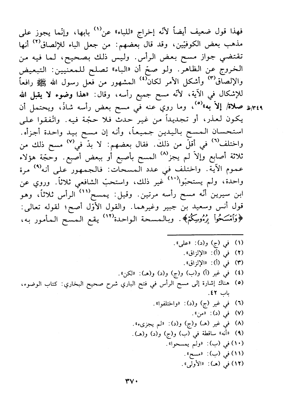 فهذا قول ضعيف أيضًا لأنه إخراج ((للباء)) عن بابها، وإنما يجوز على مذهب بعض الكوفيين، وقد قال بعضهم: من جعل الباء للإلصاق أنها تقتضي جواز مسح بعض الرأس. وليس ذلك بصحيح، لما فيه من الخروج عن الظاهر. ولو صح أن ((الباء)) تصلح للمعنيين: التبعيض والإلصاق وأشكل الأمر لكان المشهور من فعل رسول الله صلى الله عليه وسلم رافعًا للإشكال في الآية، لأنه مسح جميع رأسه، وقال: ((هذا وضوء لا يقبل الله الصلاة إلا به))، وما وري عنه في مسح بعض رأسه شاذ، ويحتمل أن يكون لعذر، أو تجديدًا من غير حجة فيه. واتفقوا على استحسان المسح باليدين جميعًا، وأنه إن مسح بيد واحدة أجزأه. واختلف في أقل من ذلك. فقال بعضهم: لا بد في مسح ذلك من ثلاثة أصابع وإلا لم يجز المسح بأصبع أو ببعض أصبع. وحجة هؤلاء عموم الآية. واختلف في عدد المسحات: فالجمهور على أنه مرة واحدة، ولم يستحبوا غير ذلك، واستحب الشافعي ثلاثًا. وروي عن ابن سيرين أنه مسح رأسه مرتين. وقيل: يمسح الرأس ثلاثًا، وهو قول أنس وسعيد بن جبير وغيرهما. والقول الأول أصح؛ لقوله تعالى: {وامسحوا برؤوسكم}. وبالمسحة الواحدة يقع المسح المأمور به،