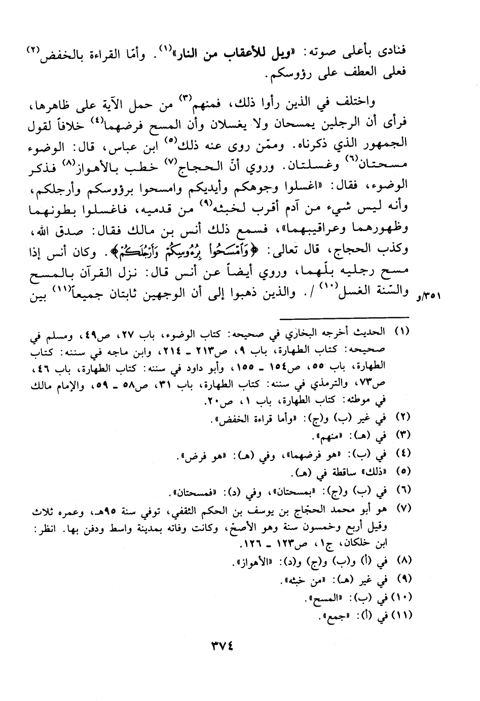 واختلف في الذين رأوا ذلك، فمنهم من حمل الآية على ظاهرها، فرأى أن الرجلين يمسحان ولا يغسلان وأن المسح فرضهما خلافًا لقول الجمهور الذي ذكرناه. وممن روى عنه ذلك ابن عباس، قال: الوضوء مسجتنا وغسلتان. وروي أن الحجاج خطب بالأهواز فذكر الوضوء، فقال: ((اغسلوا وجوهكم وأيديكم وامسحوا برؤوسكم وأرجلكم، وأنه ليس شيء من آدم أقرب لخبثه من قدميه، فاغسلوا بطونهما وظهورهما وعراقيبهما))، فسمع ذلك أنس بن مالك فقال: صدق الله، وكذب الحجاج، قال تعالى: {وامسحوا برؤوسكم وأرجلكم}. وكان أنس إذا مسح رجليه بلهما، وروي أيضًا عن أنس قال: نزل القرآن بالمسح والسنة الغسل. والذين ذهبوا إلى أن الوجهين ثابتان جميعًا بين
