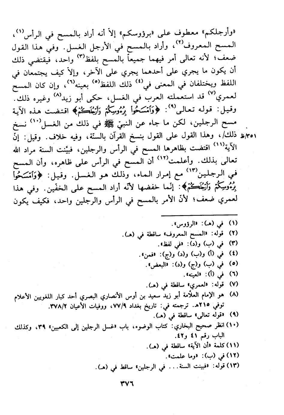 ((وأرجلكم)) معطوف على ((برؤوسكم)) إلا أنه أراد بالمسح في الرأس، المسح المعروف، وأراد بالمسح في الأرجل الغسل. وفي هذا القول ضعف؛ لأنه تعالى أمر فيهما جميعًا بالمسح بلفظ واحد، فيقتضي ذلك أن يكون ما يجري على أحدهما يجري على الآخر، إلا كيف يجتمعان في اللفظ ويختلفان في المعنى في ذلك اللفظ بعينه، وإن كان المسح لعمري قد استعملته العرب في الغسل، حكى أبو زيد وغيره ذلك. وقيل: قوله تعالى: {وامسحوا برؤوسكم وأرجلكم} اقتضت هذه الآية مسح الرجلين، لكن ما جاء عن النبي صلى الله عليه وسلم في ذلك من الغسل نسخ ذلك، وهذا القول على القول بنسخ القرآن بالسنة، وفيه خلاف. وقيل: إن الآية اقتضت بظاهرها المسح في الرأس والرجلين، فبينت السنة مراد الله تعالى بذلك. واعلمت أن المسح في الرأس على ظاهره، وأن المسح في الرجلين مع إمرار الماء، وذلك هو الغسل. وقيل: {فامسحوا برؤوسكم وأرجلكم}: إنما خفضها لأنه أراد المسح على الخفين. وفي هذا لعمري ضعف؛ لأن الأمر بالمسخ في الرأس والرجلين واحد، فكيف يكون