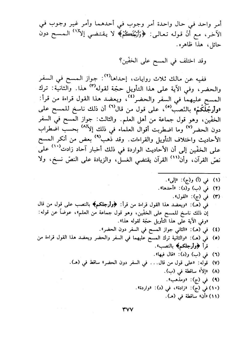 ففيه عن مالك ثلاث روايات، إحداها: جواز المسح في السفر والحضر، وفي الآية على هذا التأويل حجة لقوله هذا. والثانية: ترك المسح عليهما في السفر والحضر، ويعضد هذا القول قراءة من قرأ: ((وأرجلكم)) بالنصب، على قول من قال أن ذلك ناسخ للمسح على الخفين، وهو قول جماعة من أهل العلم. الثالث: جواز المسح في السفر دون الحضر وما اضطربت أقوال العلماء في ذلك إلا بحسب اضطراب الأحاديث واختلاف التأويل والقراءات. وقد ذهب بعض من أنكر المسح على الخفين إلى أن الأحاديث الواردة في ذلك أحبار آحاد زادت على نص القرآن، وأن القرآن يقتضي الغسل، والزيادة على النص نسخ، ولا