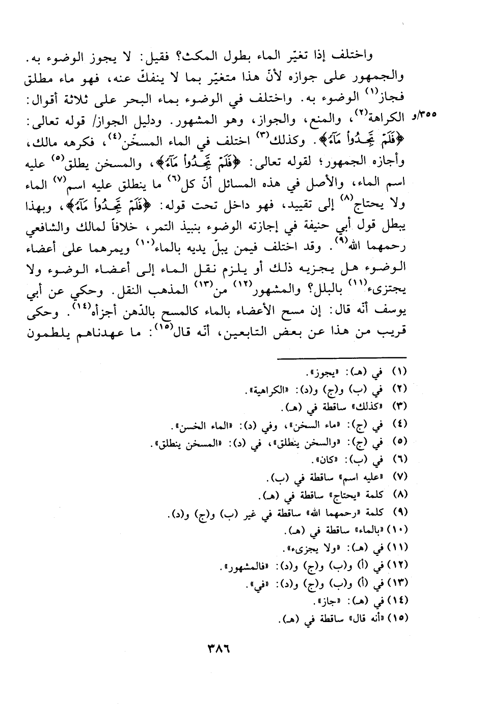 واختلف إذا تغير الماء بطول المكث؟ فقيل: لا يجوز الوضوء به. والجمهور على جوازه لأن هذا متغير بما لا ينفك عنه، فهو ماء مطلق فجاز الوضوء به. واختلف في الوضوء بماء البحر على ثلاثة أقوال: الكراهة، والمنع، والجواز، وهو المشهور. ودليل الجواز قوله تعالى: {فلم تجدوا ماء}. وكذلك اختلف في الماء المسخن، فكرهه مالك، وأجازه الجمهور؛ لقوله تعالى: {فلم تجدوا ماء}، والماء المسخن يطلق عليه اسم الماء، والأصل في هذه المسائل أن كل ما ينطلق عليه اسم الماء ولا يحتاج إلى تقييد، فهو داخل تحت قوله: {فلم تجدوا ماء}، وبهذا يبطل قول أبي حنيفة في إجازته الوضوء بنبيذ التمر، خلافًا لمالك والشافعي رحمهما الله. وقد اختلف فيمن يبل يديه بالماء ويمرهما على أعضاء الوضوء هل يجزيه ذلك أو يلزم نقل الماء إلى أعضاء الوضوء ولا يجتزئ بالبلل؟ والمشهور من المذهب النقل. وحكي عن أبي يوسف أنه قال: إن مسح الأعضاء بالماء كالمسح بالدهن أجزأه. وحكى قريب من هذا عن بعض التابعين، أنه قال: ما عهدناهم يلطمون