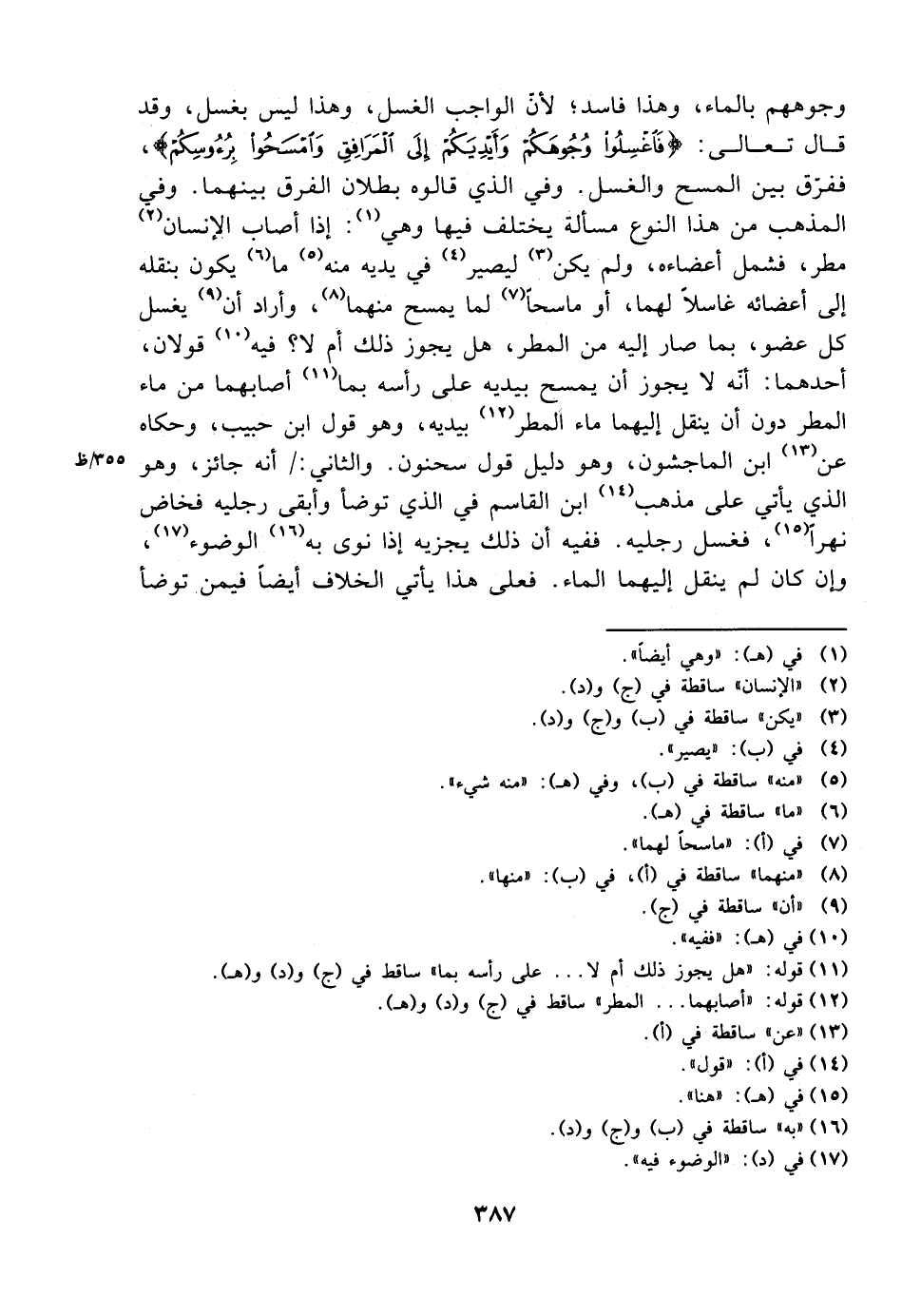 وجوههم بالماء، وهذا فاسد؛ لأن الواجب الغسل، وهذا ليس بغسل، وقد قال تعالى: {فاغسلوا وجوهكم وأيديكم إلى المرافق وامسحوا برؤوسكم}، ففرق بين المسح والغسل. وفي الذي قالوه بطلان الفرق بينهما. وفي المذهب من هذا النوع مسألة يختلف فيها وهي: إذا أصاب الإنسان مطر، فشمل أعضاءه، ولم يكن ليصير في يديه منه ما يكون بنقله إلى أعضائه غاسلًا لهما، أو ماسحًا لما يمسح منهما، وأراج أن يغسل كل عضو، بما صار إليه من المطر، هل يجوز ذلك أم لا؟ فيه قولان، أحدهما: أنه لا يجوز أن يمسح بيديه على رأسه بما أصابهما من ماء المطر دون أن ينقل إليهما ماء المطر بيديه، وهو قول ابن حبيب، وحكاه عن ابن الماجشون، وهو دليل قول سحنون. والثاني: أنه جائز، وهو الذي يأتي على مذهب ابن القاسم في الذي توضأ وأبقى رجليه فخاض نهرًا، فغسل رجليه. ففيه أن ذلك يجزيه إذا نوى به الوضوء، وإن كان لم ينقل إليهما الماء. فعلى هذا يأتي الخلاف أيضًا فيمن توضأ