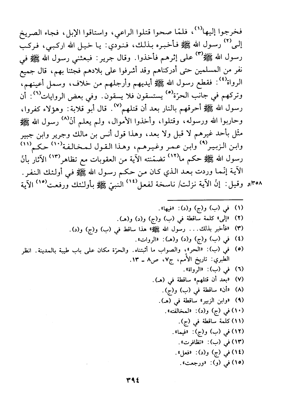 فخرجوا إليها، فما صحوا قتلوا الراعي، واستاقوا الإبل، فجاء الصريخ إلى رسول الله صلى الله عليه وسلم فأخبره بذلك، فنودي: يا خيل الله اركبي، فركب رسول الله صلى الله عليه وسلم على إثرهم فأخذوا، وقال جرير: فبعثني رسول الله صلى الله عليه وسلم في نفر من المسلمين حتى أدركناهم وقد أشرفوا على بلادهم فجئنا بهم، قال جميع الرواة: فقطع رسول الله صلى الله عليه وسلم أيديهم وأرجلهم من خلاف، وسمل أعينهم، وتركهم في جانب من الحرة يستسقون فلا يسقون. وفي بعض الروايات: أن رسول الله صلى الله عليه وسلم أحرقهم بالنار بعد أن قتلهم. قال أبو قلابة: وهؤلاء كفروا، وحاربوا الله ورسوله، وقتلوا، وأخذوا الأموال، ولم يعلم أن رسول الله صلى الله عليه وسلم مثل بأحد غيرهم لا قبل ولا بعد، وهذا قول أنس بن مالك وجرير وابن جبير وابن الزبير وابن عمر وغيرهم، وهذا القول لمخالفة حكم رسول الله صلى الله عليه وسلم حك ما تضمنته الآية من العقوبات مع تظاهر الآثار بأن الآية إنما وردت بعد الذي كان م حكم رسول الله صلى الله عليه وسلم في أولئك النفر. وقيل: إن الآية نزلت ناسخة لفعل النبي صلى الله عليه وسلم بأولئك ورفعت الآية