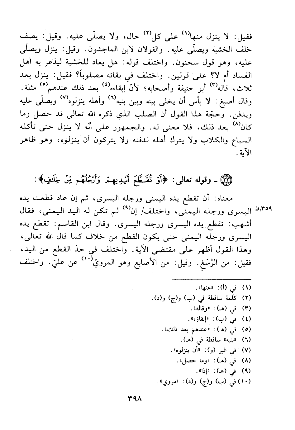معناه: أن تقطع يده اليمنى ورجله اليسرى، ثم إن عاد قطعت يده اليسرى ورجله اليمنى، واختلف إن لم تكن له اليد اليمنى، فقال أشهب: تقطع يده اليسرى ورجله اليسرى. وقال ابن القاسم: تقطع يده اليسرى ورجله اليمنى حتى يكون القطع من خلف كما قال الله تعالى، وهذا القول أظهر على مقتضى الآية. واختلف في حد القطع من اليد، فقيل: من الرسغ. وقيل: من الأصابع وهو المروي عن علي. واختلف