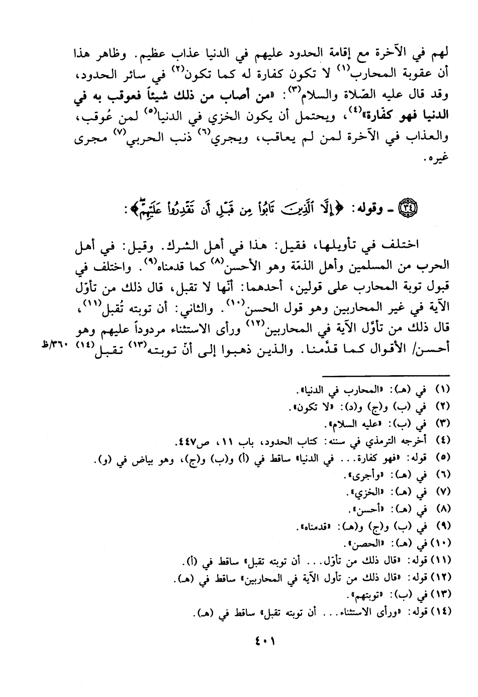 اختلف في تأويلها، فقيل: هذا في أهل الشرك. وقيل: في أهل الحرب من المسلمين وأهل الذمة وهو الأحسن كما قدمناه. واختلف في قبول توبة المحارب على قولين، أحدهما: أنها لا تقبل، قال ذلك من تأول الآية في غير المحاربين وهو قول الحسن. والثاني: أن توبته تقبل، قال ذلك من تأول الآية في المحاربين ورأى الاستثناء مردودًا عليهم وهو أحسن الأقوال كما قدمنا. والذين ذهبوا إلى أن توبته تقبل