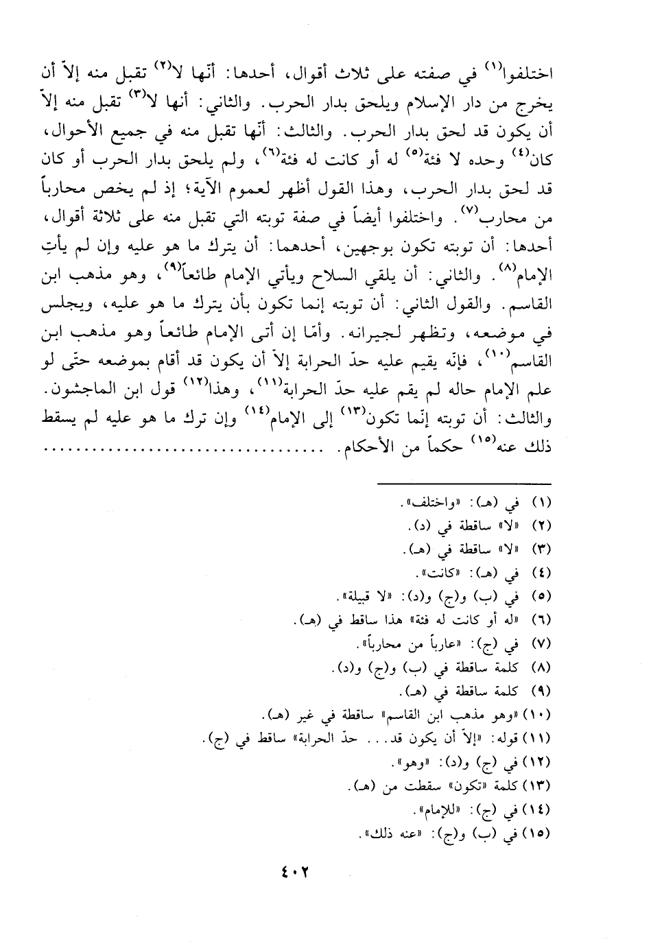 اختلفوا في صفته على ثلاثة أقوال، أحدها: أنها لا تقبل منه إلا أن يخرج من دار الإسلام ويلحق بدار الحرب. الثاني: أنها لا تقبل منه إلى أن يكون قد لحق بدار الحرب. والثالث: أنها لا تقبل منه في جميع الأحوال، كان وحده لا فئة له أو كانت له فئة، ولم يلحق بدار الحرب أو كان لحلق بدار الحرب، وهذا القول أظهر لعموم الآية؛ إذ لم يخص محاربًا من محارب. واختلفوا أيضًا في صفة توبته التي تقبل منه على ثلاثة أقوال، أحدها: أن توبته تكون بوجهين، أحدهما: أن يترك ما هو عليه وإن لم يأت الإمام. والثاني: أن يلقي السلاح ويأتي الإمام طائعًا، وهو مذهب ابن القاسم. والقول الثاني: أن توبته إنما تكون بأن يترك ما هو عليه، ويجلس في موضعه، وتظهر لجيرانه. وأما إن أتى الإمام طائعًا وهو مذهب ابن القاسم، فإنه يقيم عليه حد الحرابة، وهذا قول ابن الماجشون. والثالث: أن توبته إنما تكون إلى الإمام وإن ترك ما هو عليه لم يسقط ذلك عنه حكمًا من الأحكام ........................................................